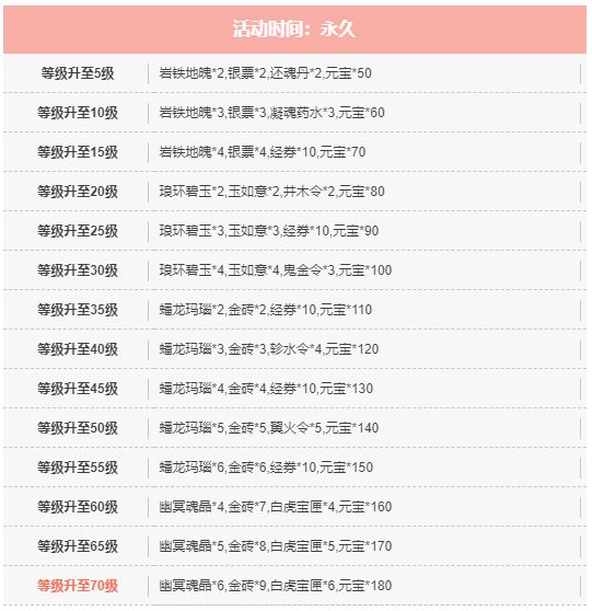 活动描述:活动期间,各位上仙达到指定等级即可领取对应档位奖励