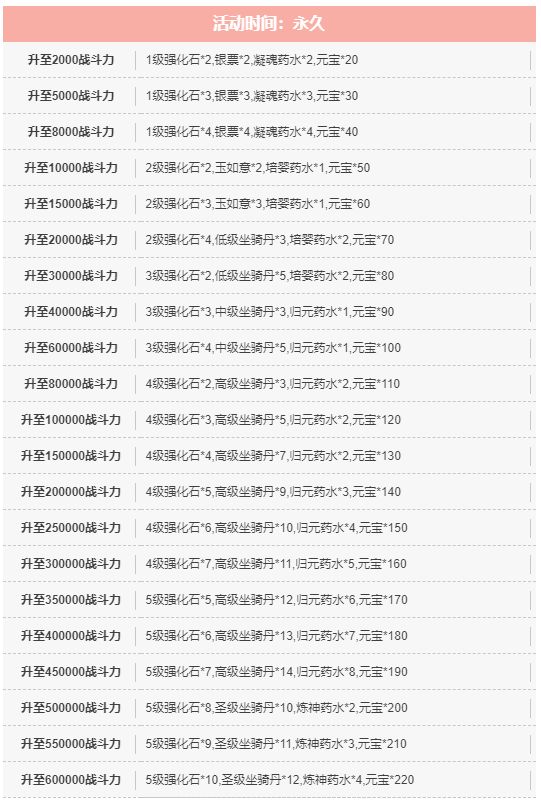 活动描述:活动期间,各位上仙达到指定战力即可领取对应档位奖励