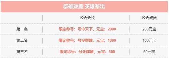 活动内容:在活动结束后公会排行榜前三的会长将会获得特殊奖励,公会成员也将获得公会礼包,奖励将在5月24号通过邮件下发
