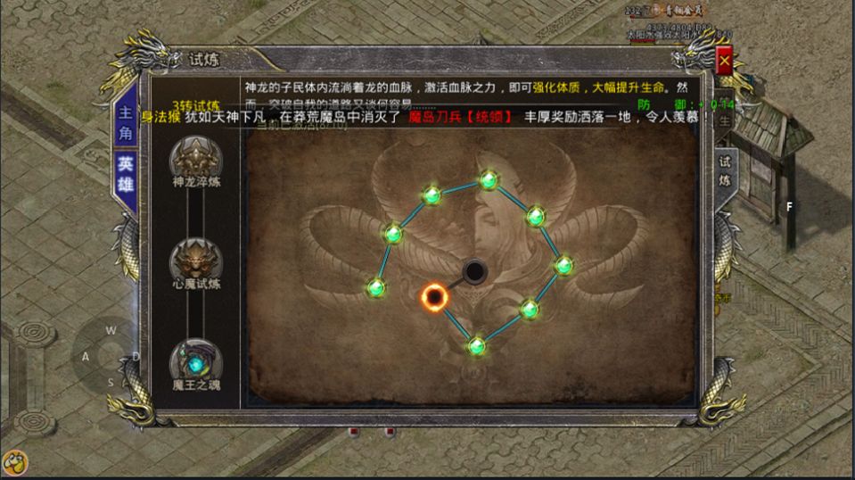 人物转生:转生是提升属性的重要成长线,等级达到45级后完成转生试炼可以提升转生,转生后可以大幅提升生命值和攻魔道属性,并且可以穿戴对应转生等级的转生装备。转生试炼分为神龙淬炼(使用转生证明进行节点升级可提升攻击力)、心魔试炼(击杀一只高级首领验证自己的实力)和魔王之魂(收集血脉精华完成试炼)三个阶段,转生证明和血脉精华怪物均有几率掉落,低转转生证明可以合成高转转生证明。