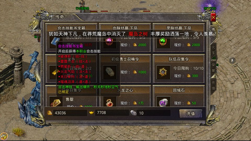 常规技能与合击技能获取:常规技能可通过书店NPC处花费金币购买基础技能书,所有BOSS怪物都有几率掉落技能书,使用技能书页可以合成主角35级技能书,使用金刚石可以合成英雄35级技能书;合击技能在商城内使用50万传奇币购买或者首充98元即可获得,根据职业组合的不同,合击技能也是不同的,学习合击技能后还需要给英雄装配火龙之心才能释放合击,火龙之心持久不足时可以使用回气膏修复。