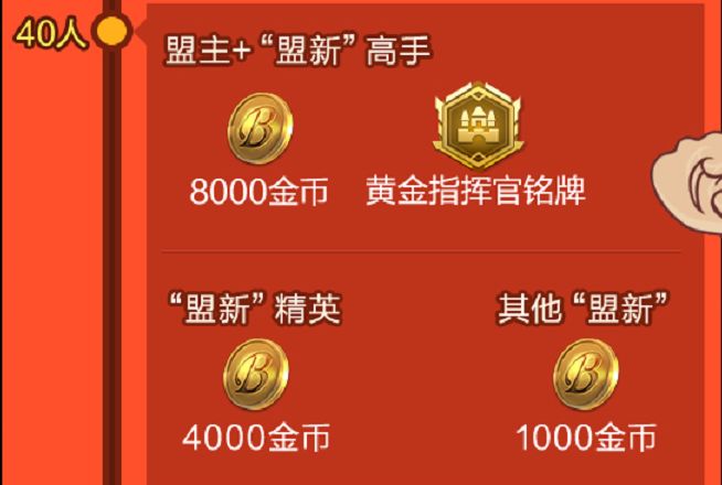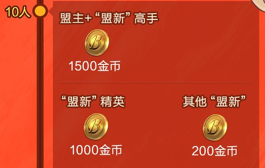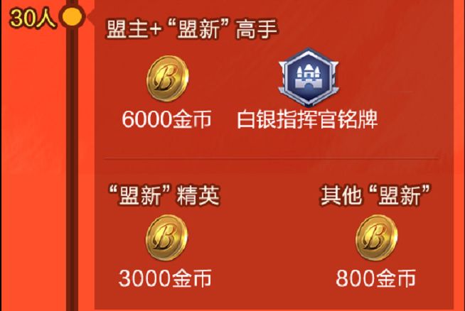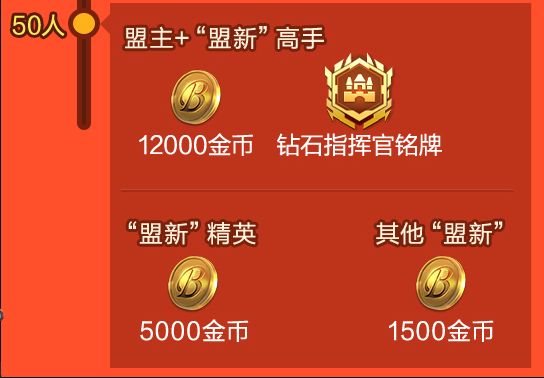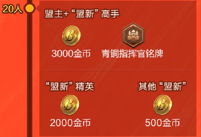 奖励内容:豪盟新贵总共5个达标档位,每个档位都会以盟主、高手、精英、萌新发放不同额度的金币奖励,“高手”为势力大于2万的成员,“精英”为势力大于5千的成员,萌新与盟主没有势力要求。