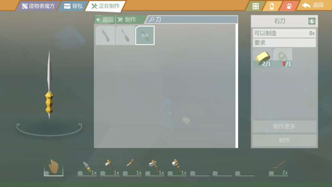 例如,小艾现在要制作一把“石刀”,打开制作面板后遇到提示,需要“1根任意绳子”以及“1块燧石”。
