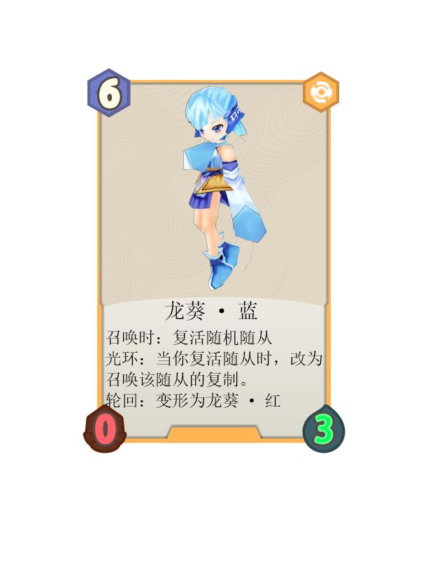 龙葵公主!同样设计成了能够不断交替轮回的卡!龙葵(蓝)设定上不具备战斗能力,所以设计为了提供增益状态的0攻光环卡。红龙葵在游戏里具有吸取力量的技能(鬼狱还神)以及诸多群体技能。