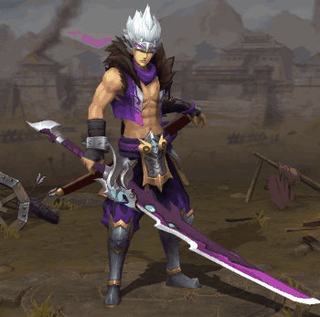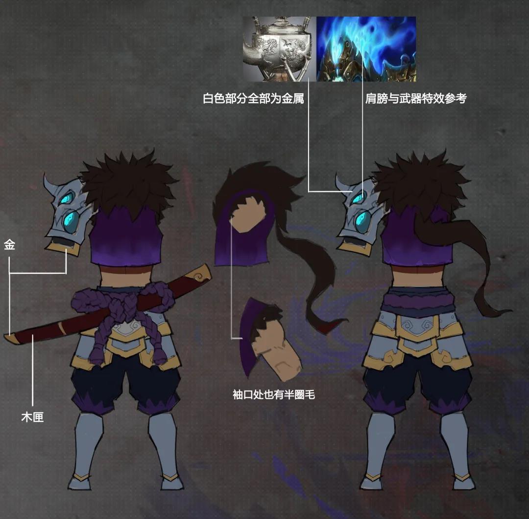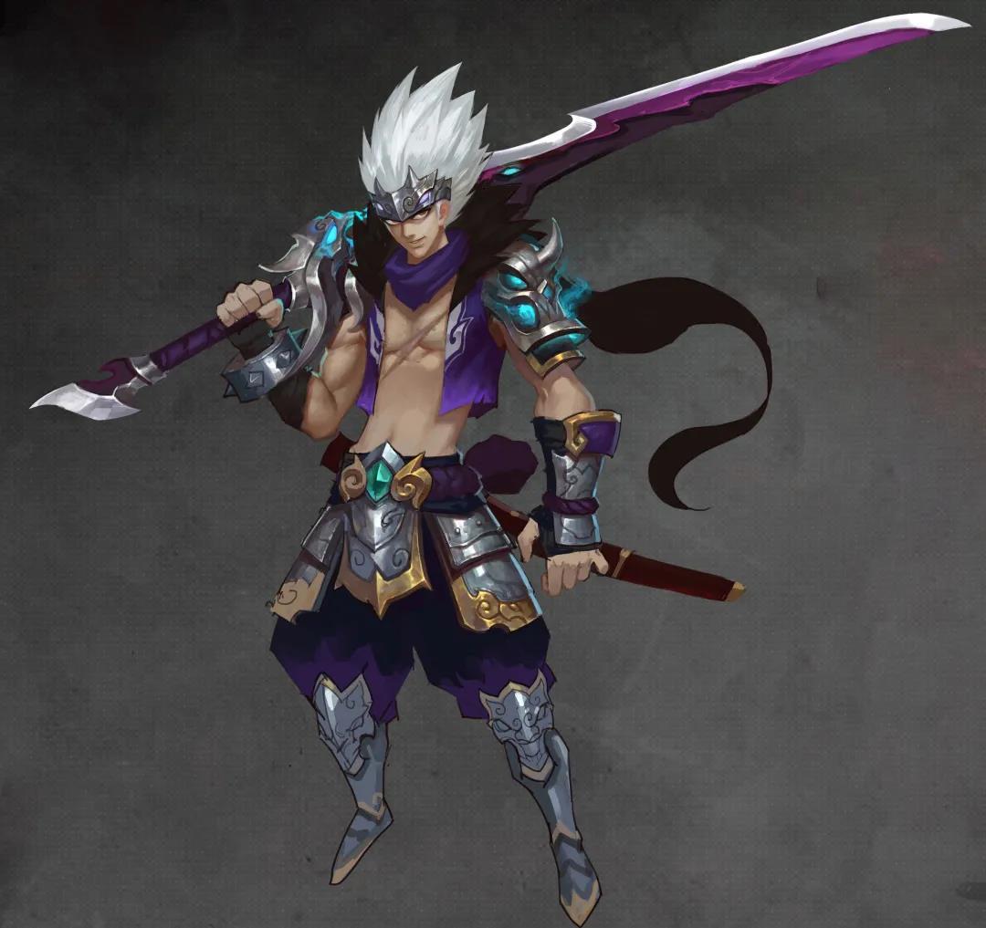 根据吕轲的背景故事,他是一名执行任务的杀手,手拿长约五尺的大刀。作为一名杀手,他应该大多数时候都是冷酷的,所以考虑到他的身份,这个人物最终选用了紫色作为吕轲的主要配色,以衬托他的英姿飒爽,胸口的刀疤也侧面反映了吕轲身经百战这样一个人生的经历。
