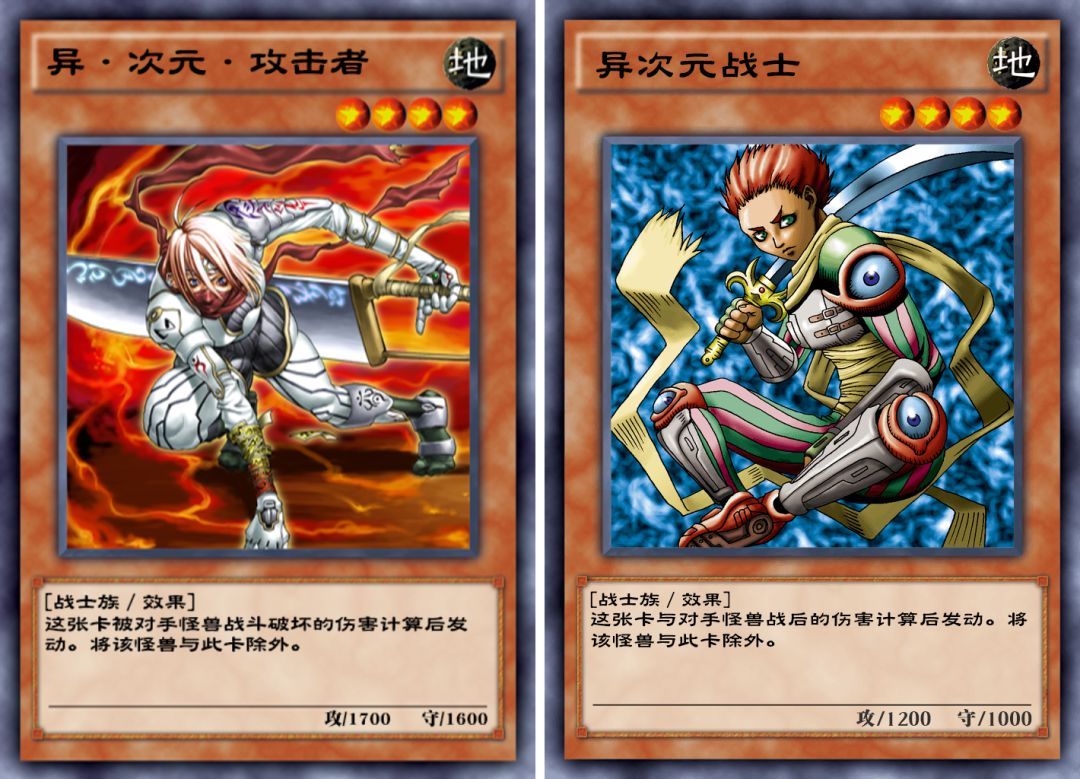 这张卡和「异次元战士」的不同点在于,「异次元战士」只要进行战斗,无论结果如何,都必定发动效果除外双方怪兽,即使与攻击力较低的怪兽战斗也要发动。而「异·次元·攻击者」必须被对手战斗破坏时才会触发效果,攻守数值也更高,不容易被对方的下级怪兽轻易破坏,精准除外对手的强力怪兽。