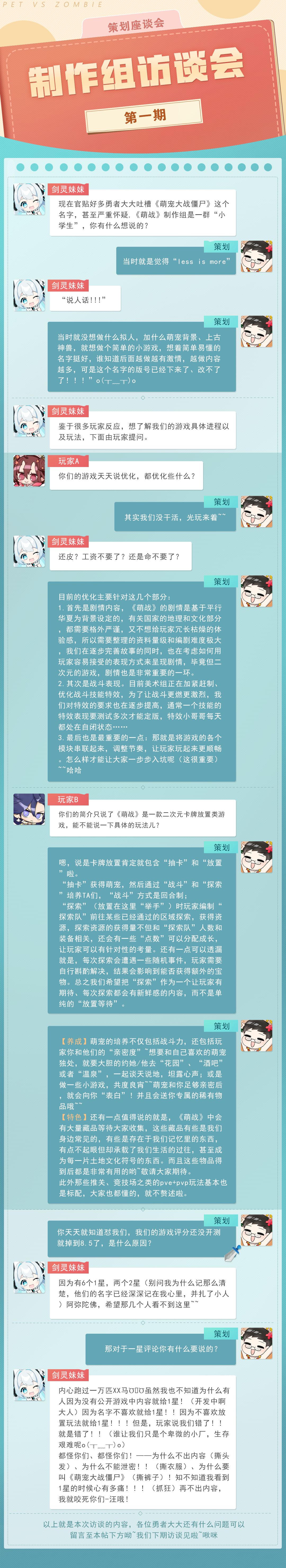 一直以来大家比较关心《萌战》的优化进程,游戏具体的玩法,以及各种小问题...为了让大家更多的了解《萌战》,剑灵妹妹开启了“制作组访谈会”第一期,我们来聊聊大家关心的那些问题吧~~