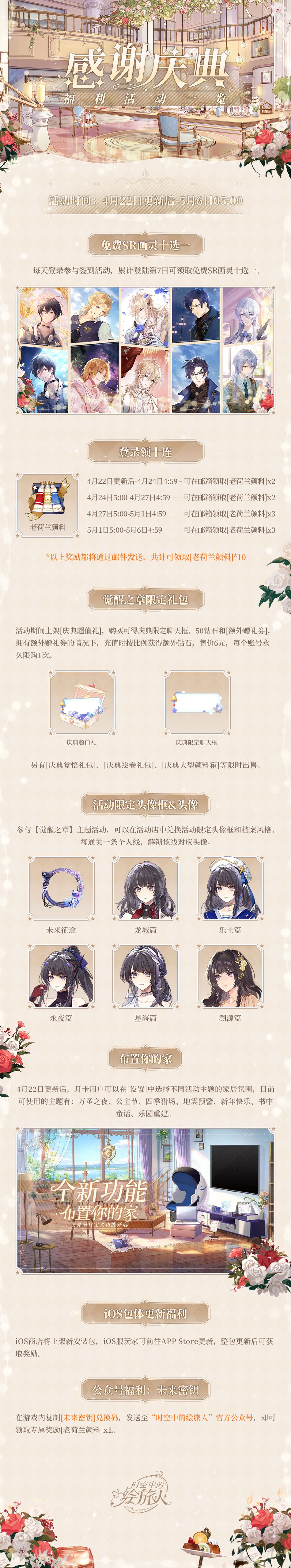 4月22日更新后将开启「感谢庆典」,登录游戏参与活动可领取免费SR画灵十选一、[老荷兰颜料]*10、限定头