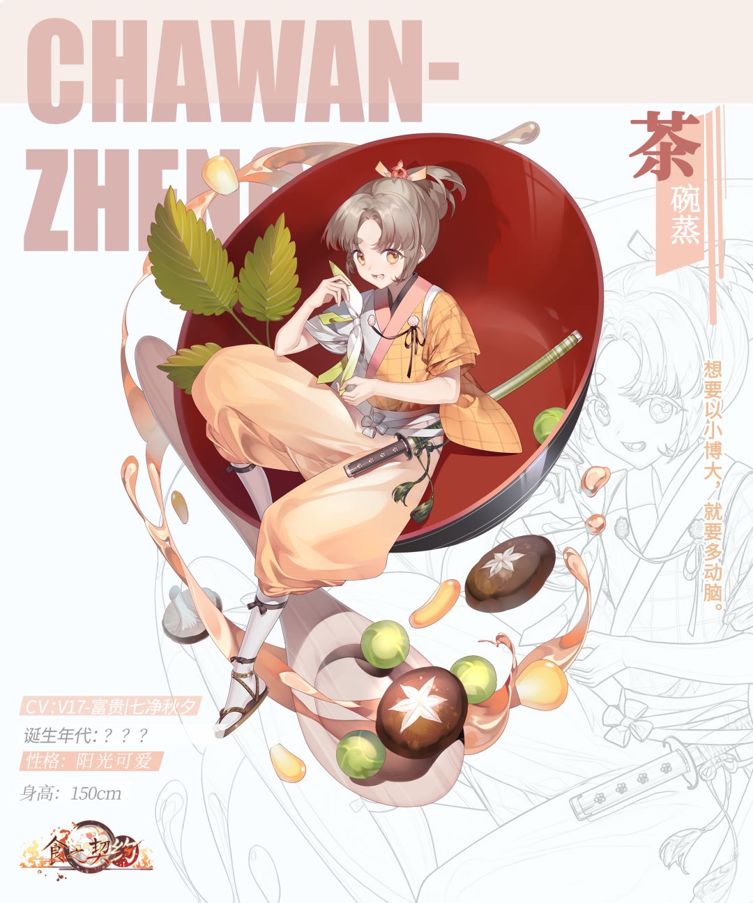茶碗蒸是用茶杯制作各种不同风味的蒸蛋羹,茶杯小小的一只,正是飨灵身高特点的灵感来源。