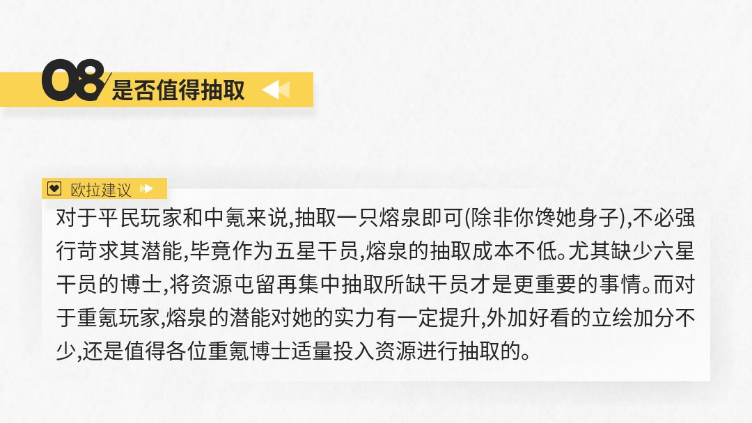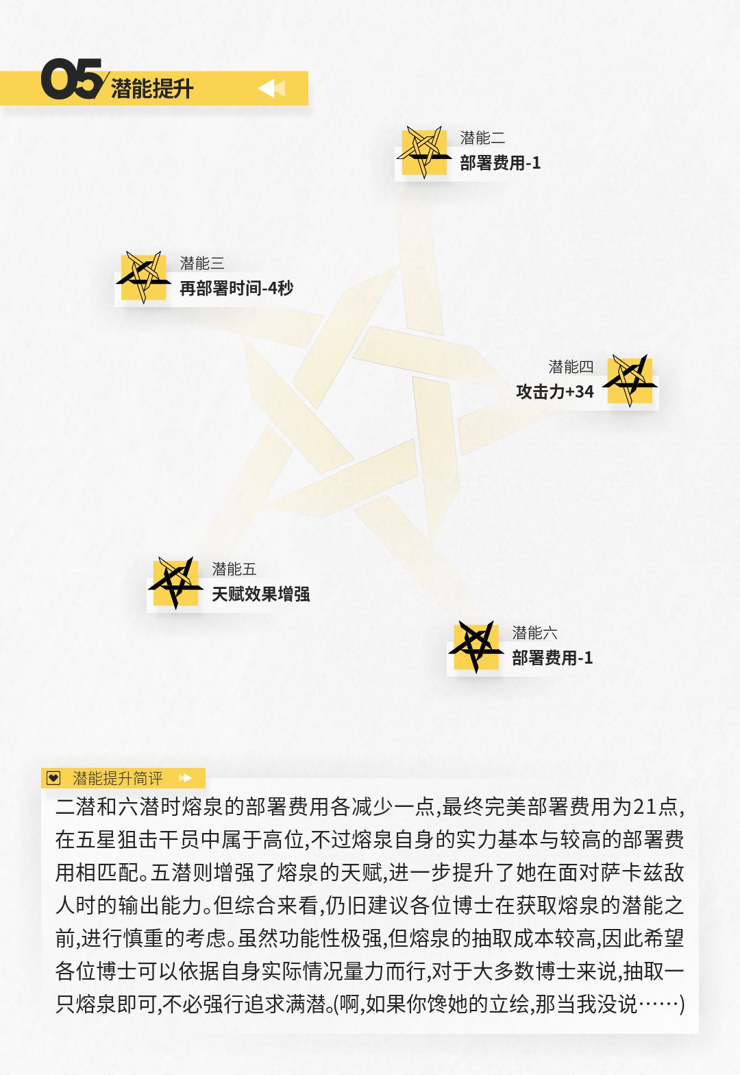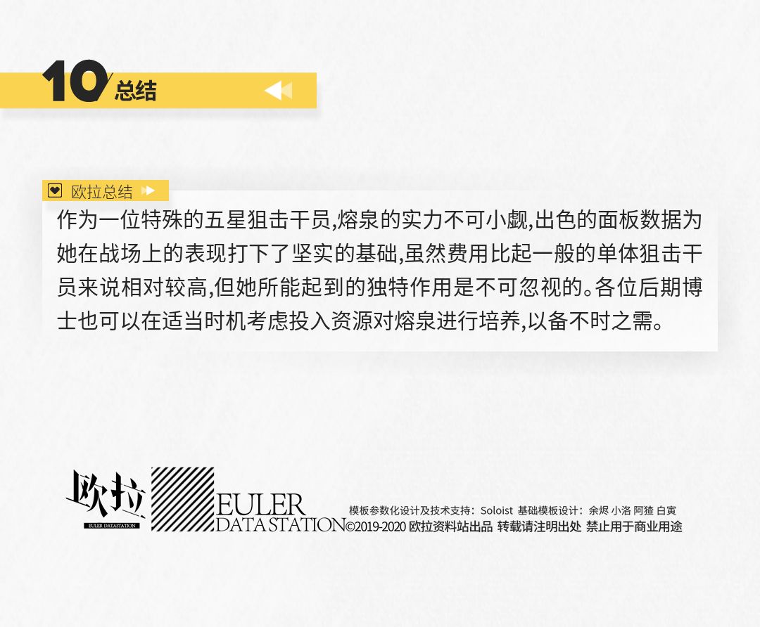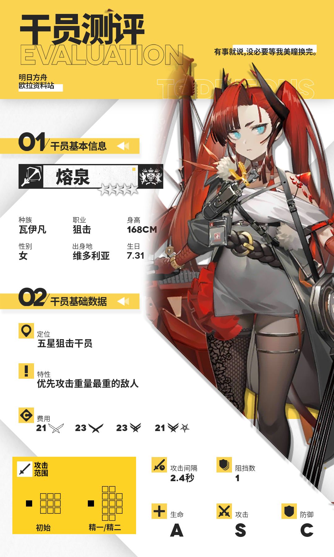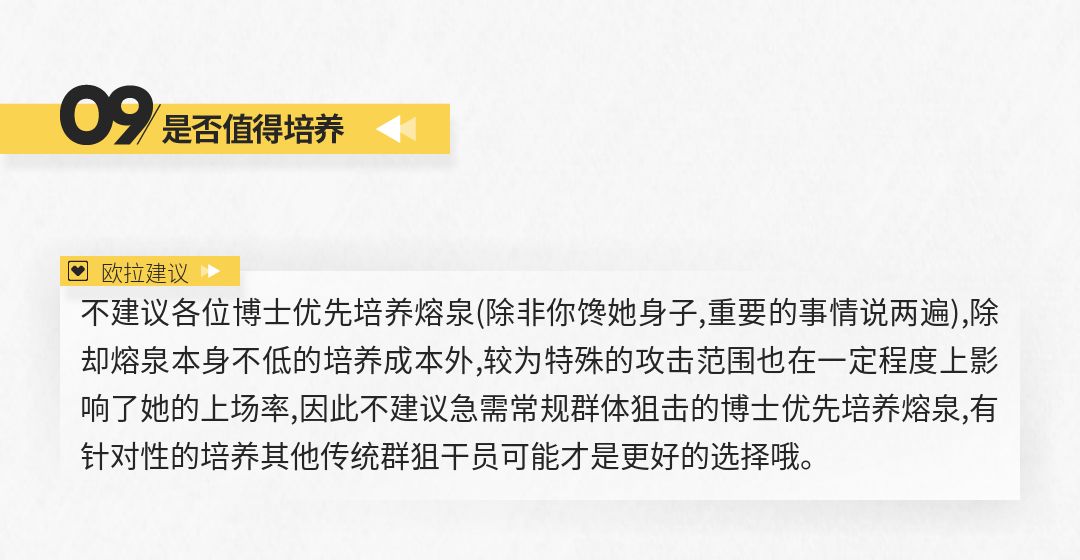 虽然熔泉的立绘非常引人注目,但许多博士也会因为熔泉这特殊的模板而对她望而却步。诚然,作为一位较为特殊的五星狙击干员,熔泉和同类型的早露一样,在大多数时间都难以上场,但不可否认的是,熔泉还是具有自身特点的,在某些特殊的情况下,她依然具有发挥自身独特作用的可能性,有需要的博士可以提前培养以备不时之需。