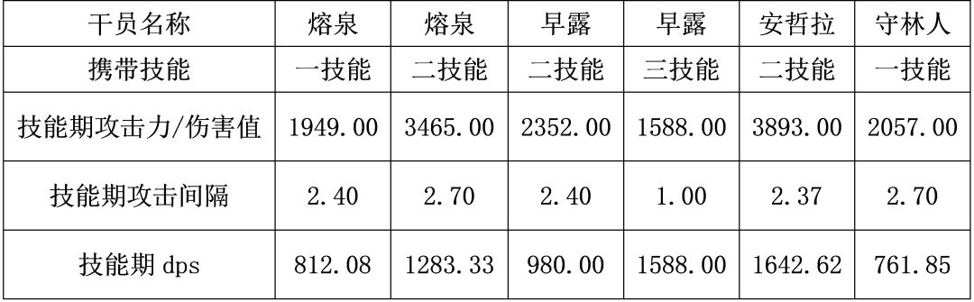注:该模块的所有数值均为在干员精二满潜满级满专精的情况下计算。表格中所有数据所呈现的情况均为该干员的满配峰值情况,即满级、满潜、满信赖、满技能等级、满天赋加成。所有非100%概率触发的天赋不参与数值计算。所有光环类天赋仅对拥有该天赋的干员自身生效。