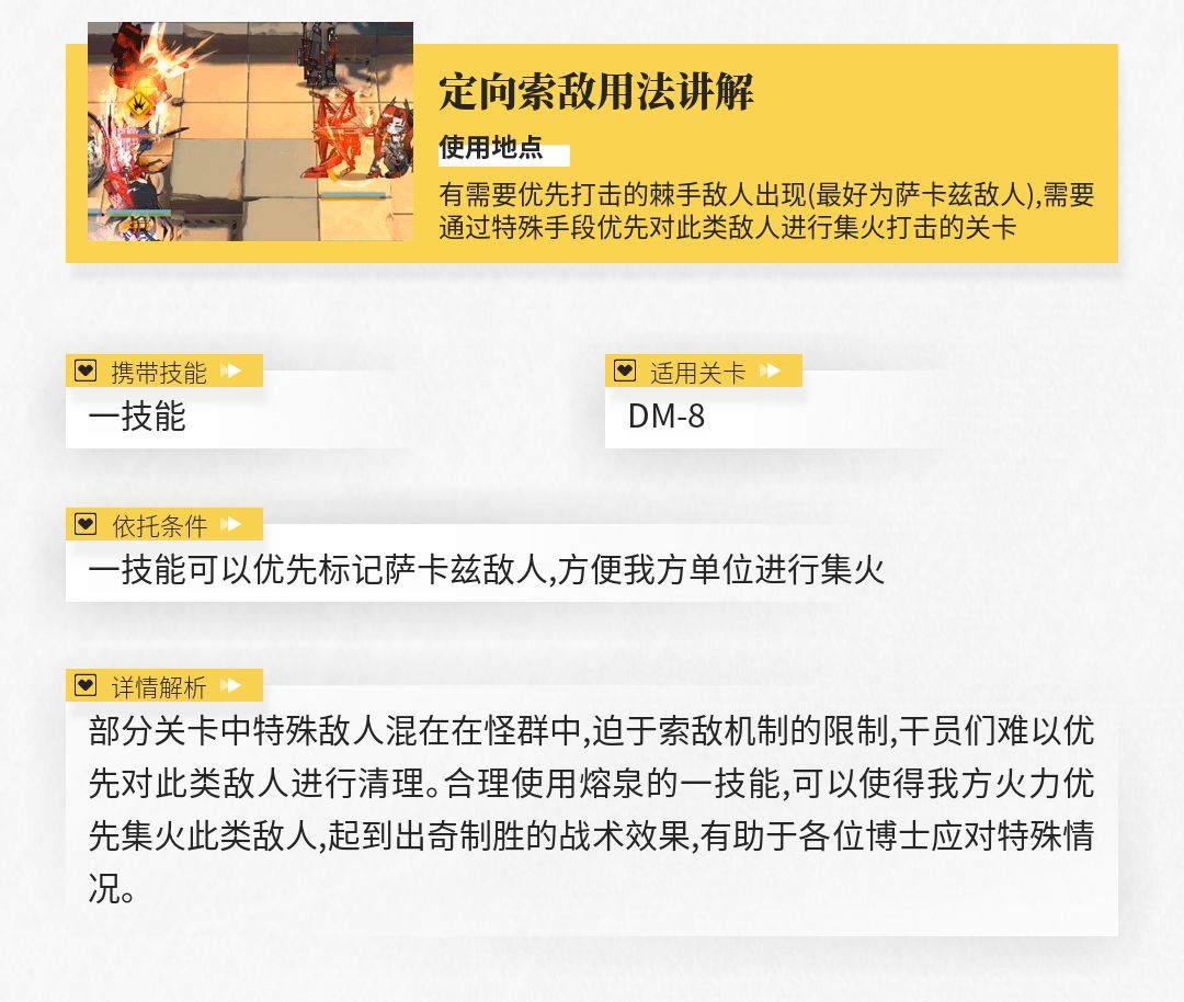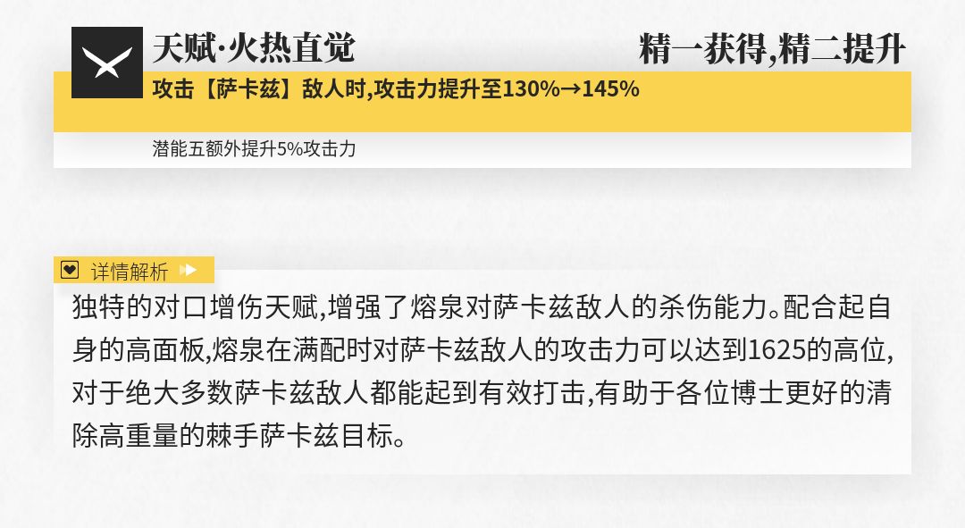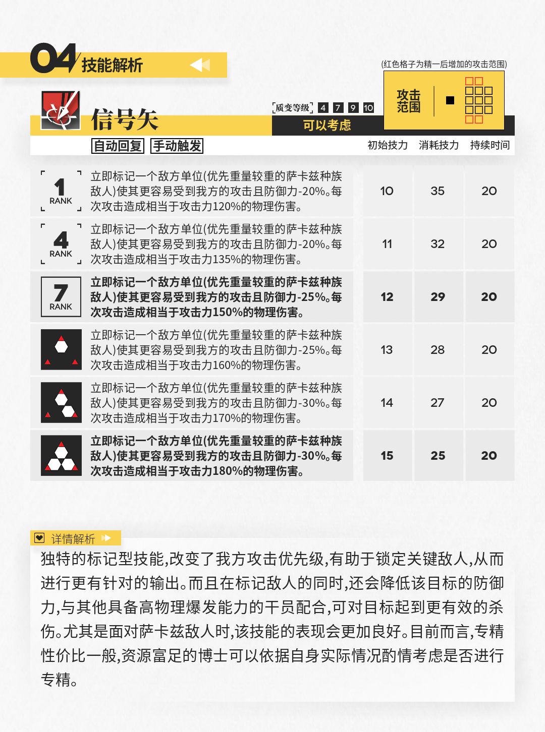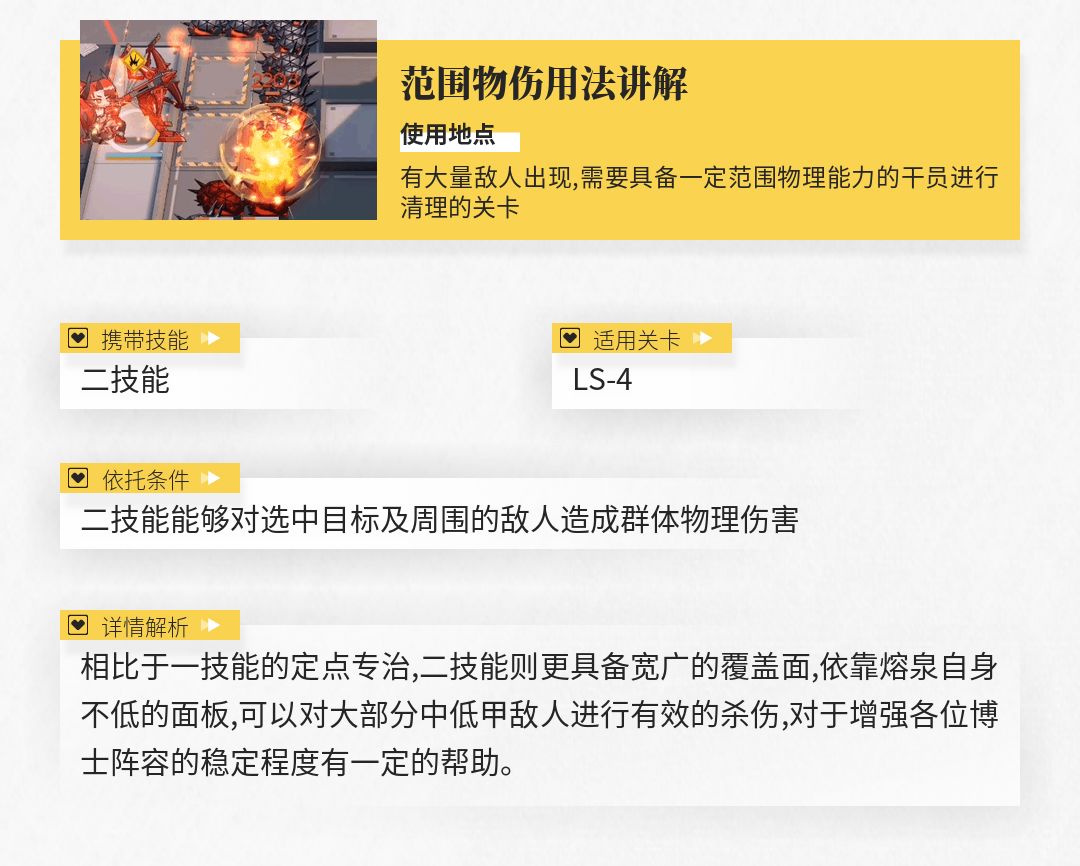 依托于较高的攻击力,熔泉的技能期输出也非常给力。二技能即使不触发天赋也能通过直接射击、爆炸对选中目标及周边敌人造成较高的伤害。虽然较长的攻击间隔对熔泉战场输出能力造成了一定影响,但她仍旧能够通过扎扎实实的每一箭为各位博士带回胜利。