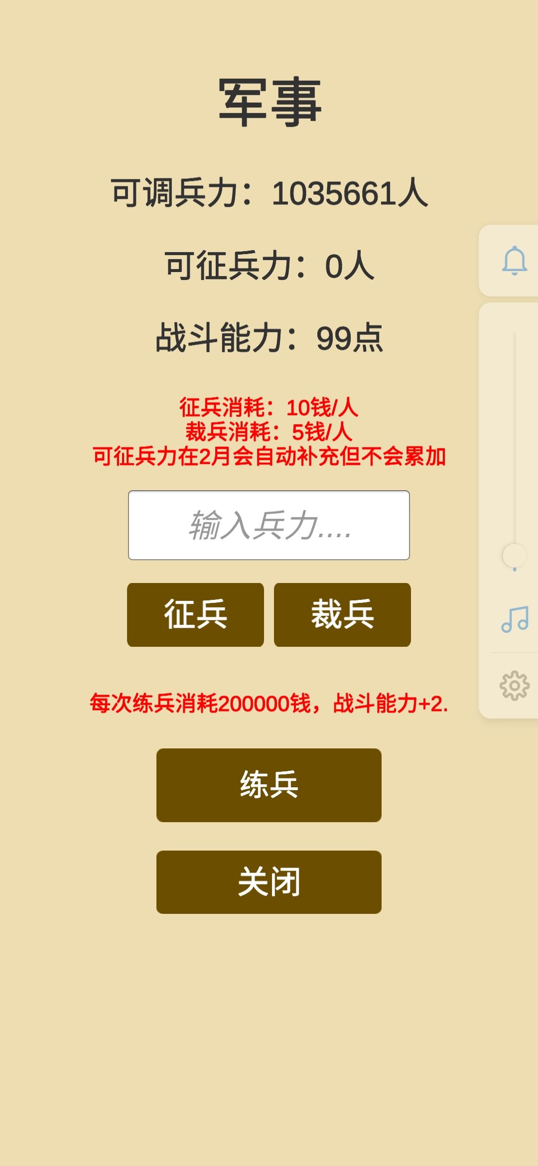 其他国家随便一个洲就差不多3500000兵力,刷出这些兵力差不多需要一百一十五到一百二十年,平均一年要点击12个完成回合加12个处理朝务加1个国家加1个征兵加差不多7次到8次的练兵、加强繁荣、加强民心加5次到10次的求医,12+12+1+1+7+5=38,38*115=4370,这还没算偶然点的家族、设置等按键,在请看下面。