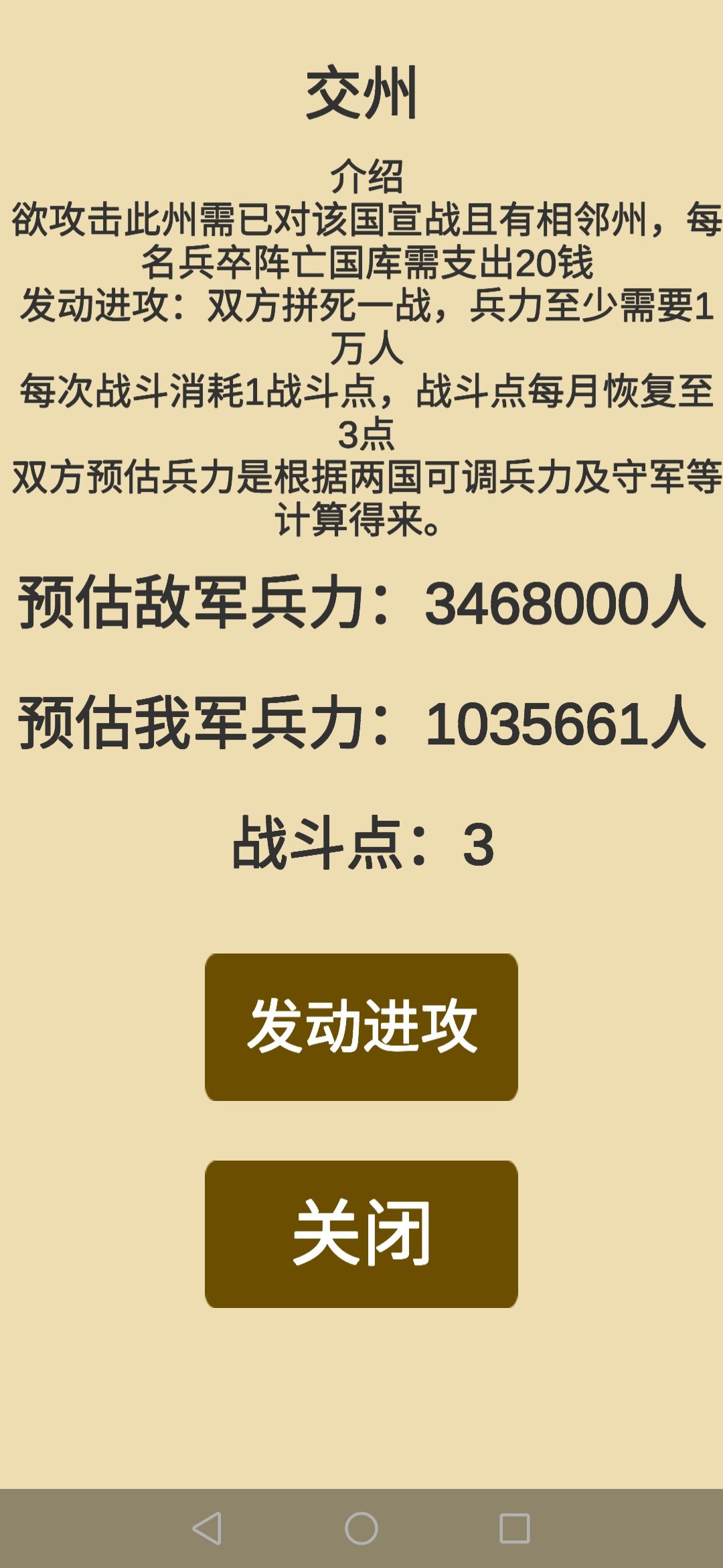 像我魏国开局就打四个洲就好了等于简单开局,去除刚好打完一个益洲也就是汉国(蜀国),就差不多残废的开局立国兵力,打下吴国需要4370*3=13110下,征兵游戏时间需要345年,吴国、蜀国如果去掉开始兵力打下的一个,分别是4370*9=39330,征兵时长1035年,4370*11=48070,征兵时长1265年,一般人连续点击几百下手都会酸痛,连续点击几万下是想把人搞残废的节奏吗?可增兵力需要加多啊,在不弄个增加兵力的升级建筑也行啊,钱到建国后没用了也是问题,可以说房屋用处也不大,走文官路线一直刷就行看见扣钱事件直接回档,有点闲钱就把部署刷满,刷到500朝廷贡献估计差不多有34百万可以贪污的钱了一直回档贪污到成功,在加上自己本来的钱,都可以直接建国了,建国就无敌了,需要改进的点太多了。