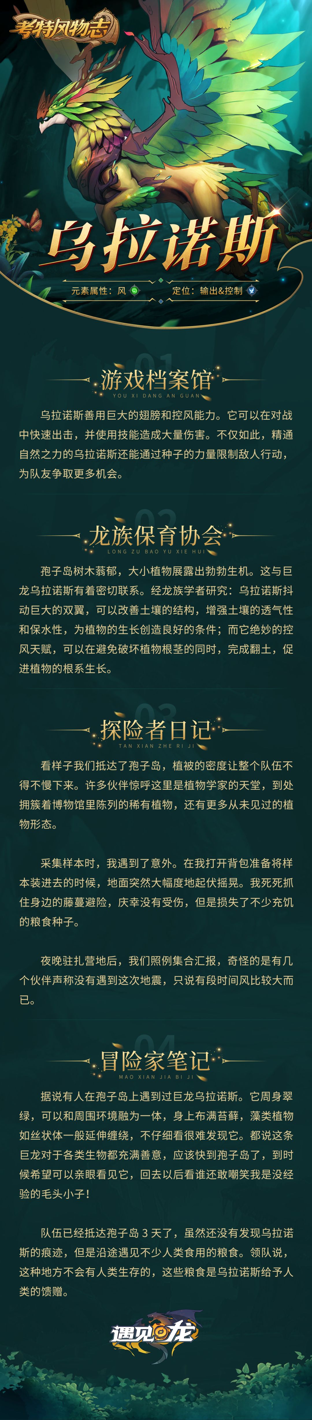 【游戏档案馆】描述了角色在游戏中的战斗表现,方便驯龙师提前了解,快速上手;而后面的【龙族保育协会】以及【探险者日记】等其他内容,均与龙族角色密切相关,相信这些有趣的研究结果和故事段落可以帮助驯龙师进一步了解繁衍数万年的龙族和神秘的考特世界。