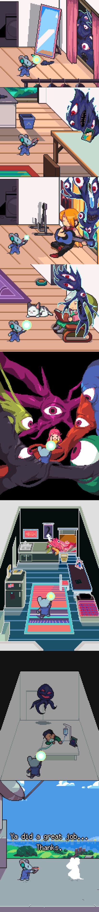 等不及汉化的就先把英文的通关了 第一次在边查字典边玩游戏 还好基本还是能理解的 不愧是Odencat家的手游 一如既往的深刻而治(致)愈(郁)最后要向boss开枪的时候我真的下不了手 一直往别的地方打😭因为这个世界的负能量和人心里的怪物 总有些人会牺牲
