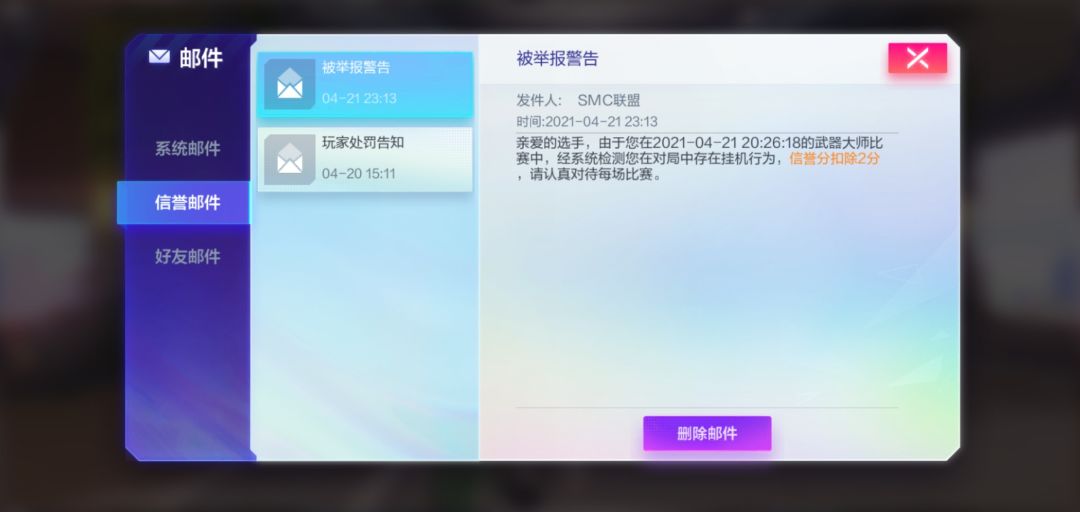今天我收到邮件,说我4月21日20:26分的游戏里挂机,扣除我信誉分,而我那把游戏获得了败方的MVP,跟我没有挂机,如果我算是挂机,其他两个队友比我还弱的战绩该怎么处罚呢