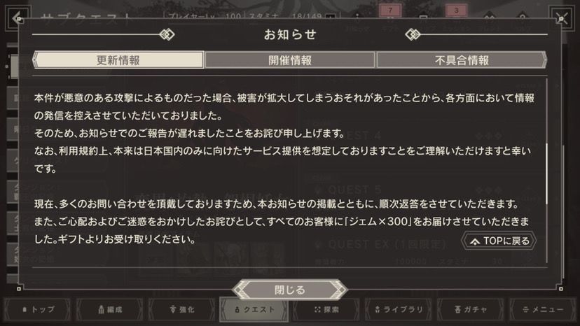 另外,作為造成各位玩家困擾及擔心的道歉,在4/22(四)約1:50將送300石給所有玩家。請從禮物箱領取。