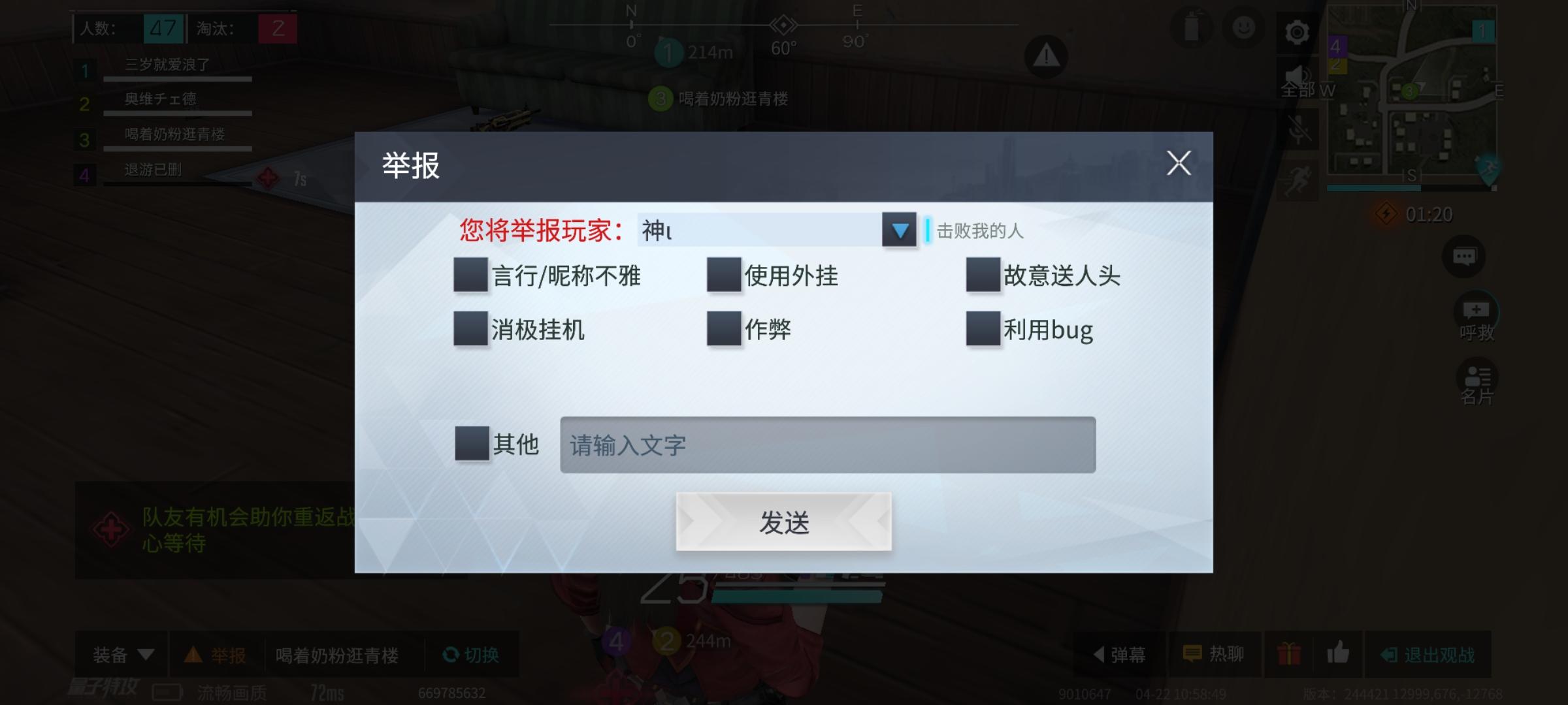【违规详情】:使用瞬移、透视、锁头等外挂击杀...