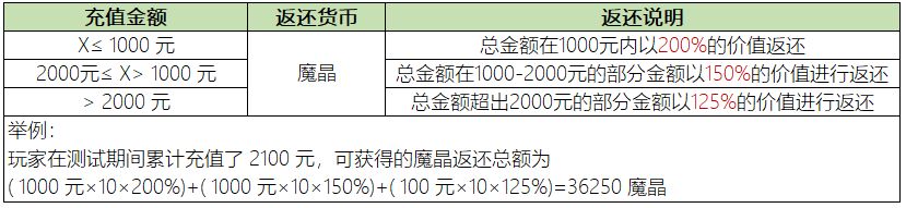 举例:玩家在测试期间累计充值了 2100 元,可获得的魔晶返还总额为:( 1000 元×10×200%)+( 1000 元×10×150%)+( 100 元×10×125%)=36250 魔晶。