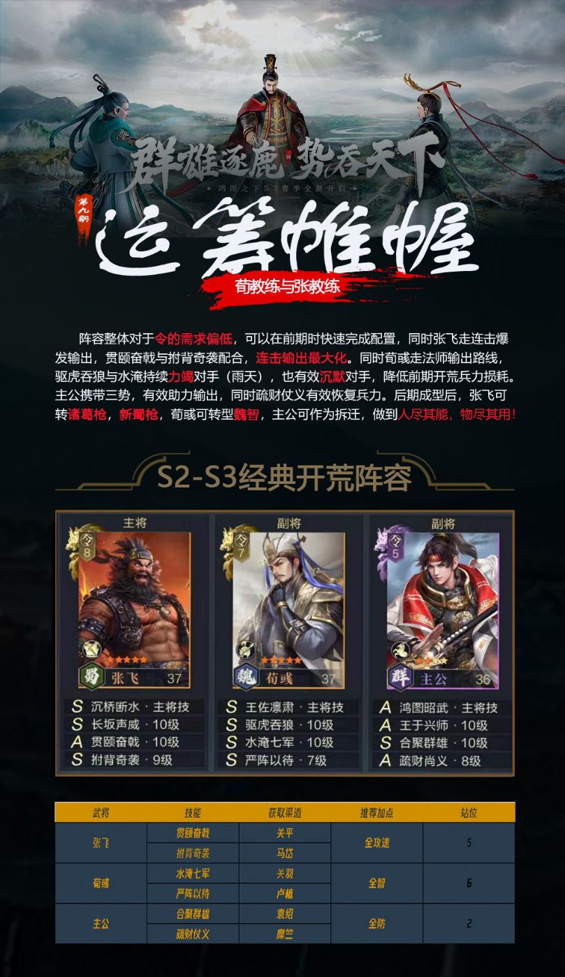 经过本人分析实测,三势张飞队为S2-S3最佳开荒队伍,同时令较低,适配快速转型,及队伍的重复利用!