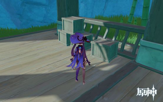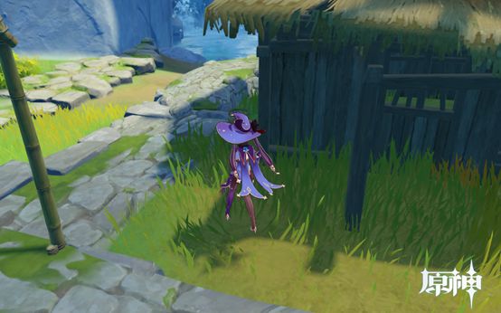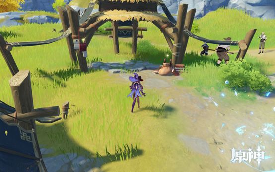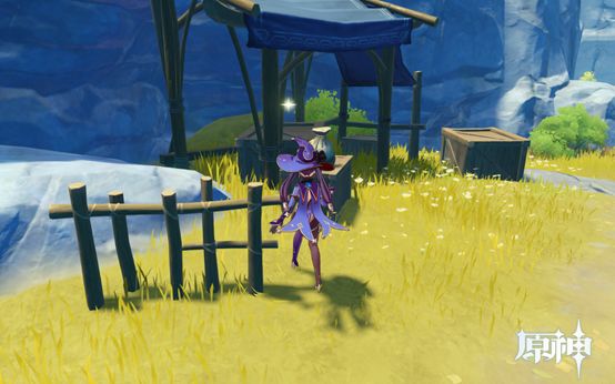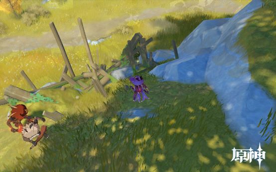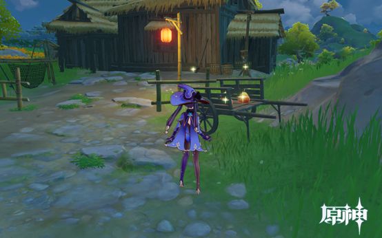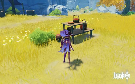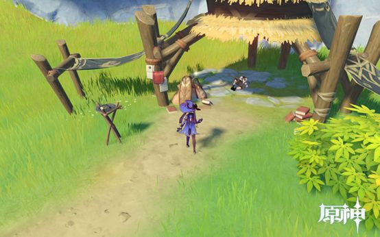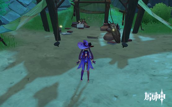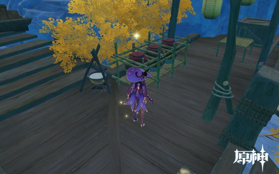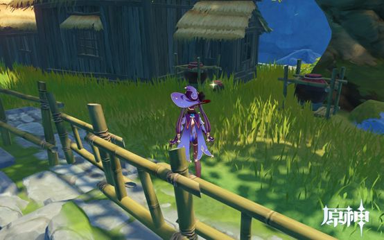 4. 传送点往前走即可看到,1个武器点和1个食物点。然后往下走过桥,桥上有个摩拉点,过桥后可看到个小房子,两个点。