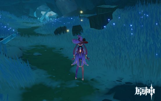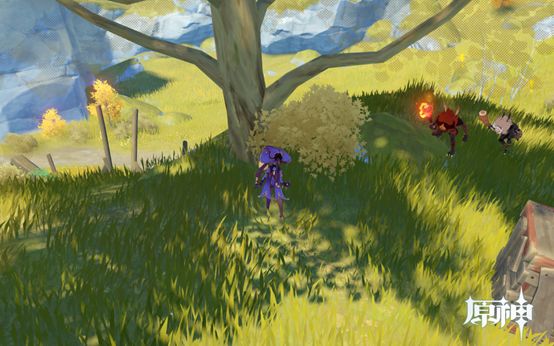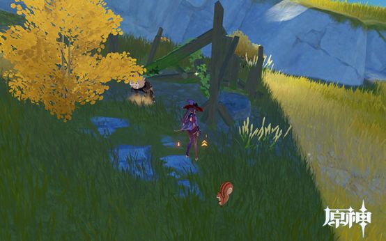 12. 传送点往地图上方峡谷走,路上有6个肉点。峡谷里3个废墟即3个圣遗物点,第二个圣遗物点前的树下有两个松茸。