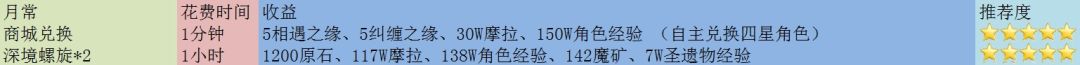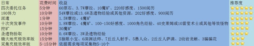 你是否每天15分钟做完四次每日任务清完体力就没事干了?锄大地效率太低不想锄?可是又想获得资源加快角色养成怎么办?本帖专为有以上烦恼的你准备,用最效率的方法收获最多的资源。每项活动都详细统计收益和花费时间,可自主选择收益更高的项目!后面更有每项活动的保姆级攻略。限于篇幅,本系列会分割放送,来个收藏、点赞、关注三连吧!