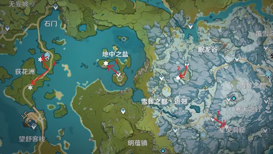 路线快速跑路小知识:间歇性冲刺是最效率的跑步方式(点按冲刺键);双风、雷泽、凯亚、莫娜、料理可以有效提升效率。