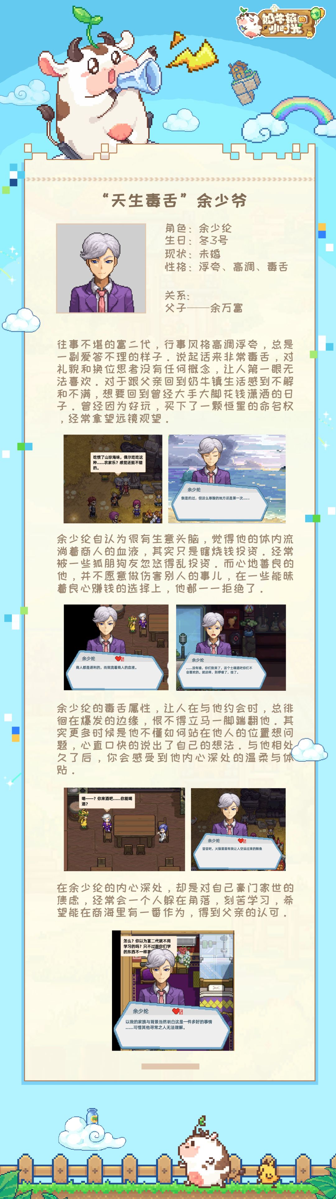 球球了解到余少纶是不少小伙伴的攻略对象,那他的人气可以说是跟球球相当了吧(但较真来讲还是比球球差了那么一丢丢),你萌不想知道他的内心世界是怎样的吗?大老板余万福为何会频频提出“收购奶牛镇”的想法呢?详情请看记者球球为大家带来的报道~