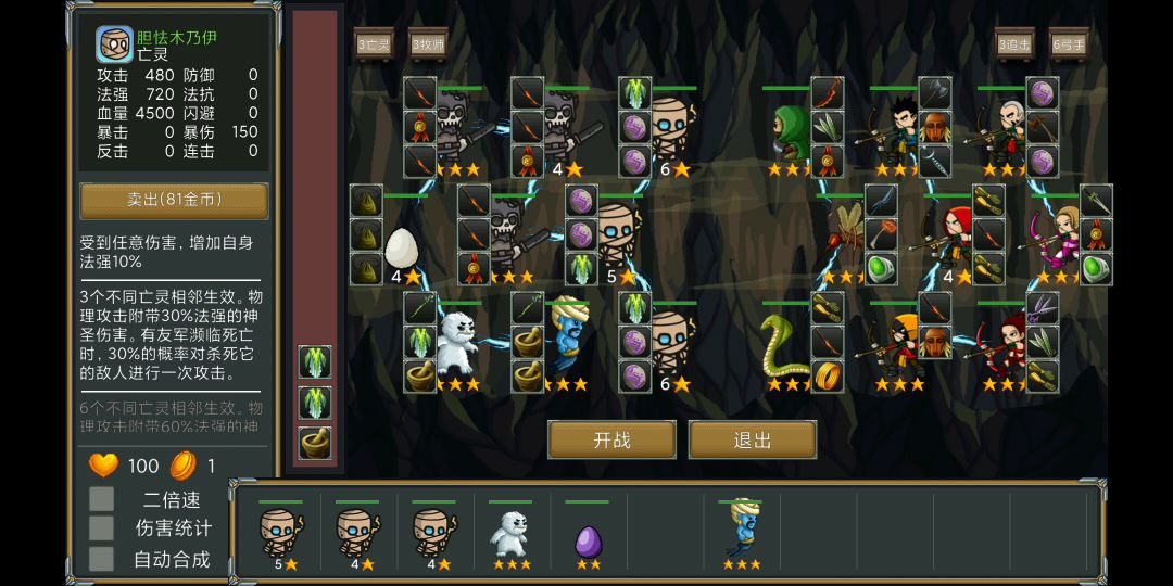 技能:受到任何伤害增加自身10%法强。亡灵阵营羁绊特性:友军被打死时30%几率会给他报仇,给对方一次普攻。点评:敢打我兄弟,小心我找上门哦。装备:精灵圣衣(加500血量,回合结束时回复自身法强80%的血量,配合大胆哥技能,越打他回得越多)。2个魔力徽章(普通攻击附带自身80%法强伤害,2个就是160%)。这里吐槽一下作者,大胆哥打架冲在最前面,又肉又有输出,兄弟有难他就上,你管他叫“胆怯‘’???