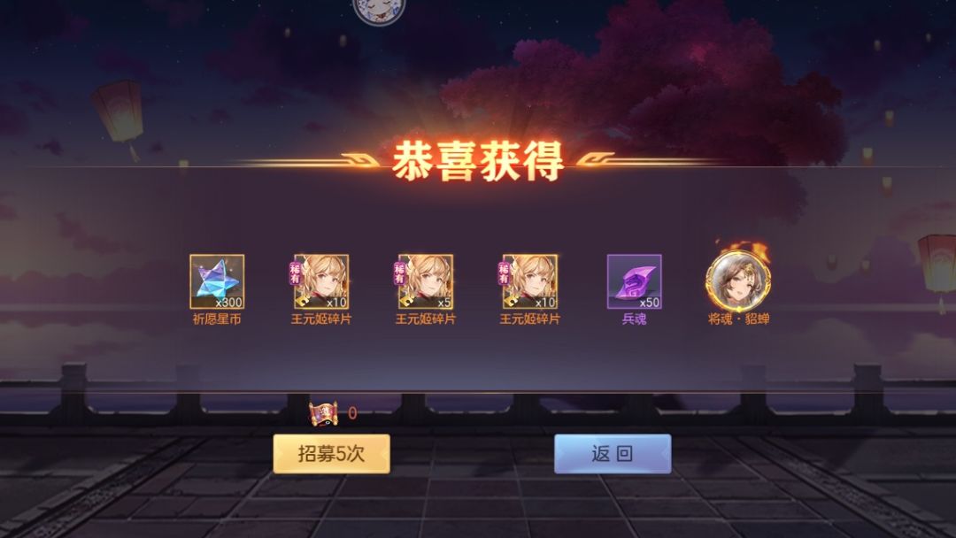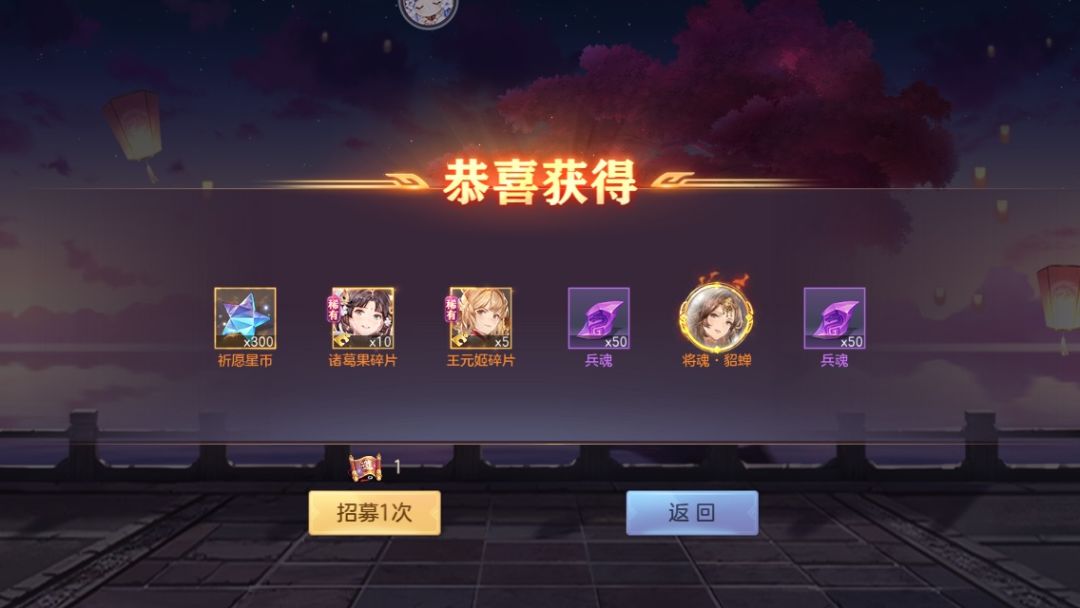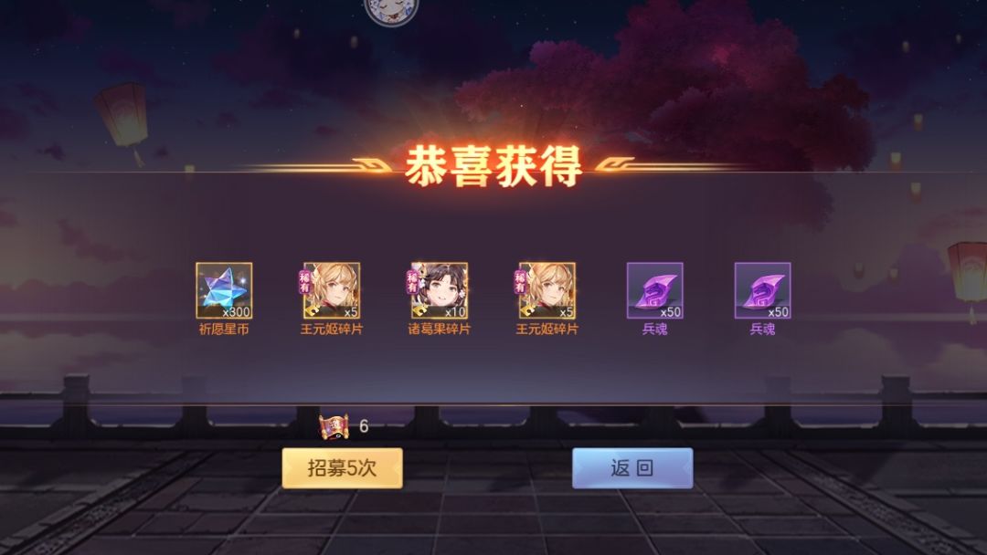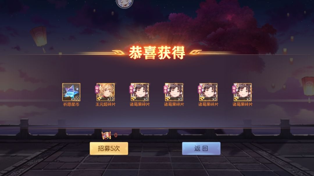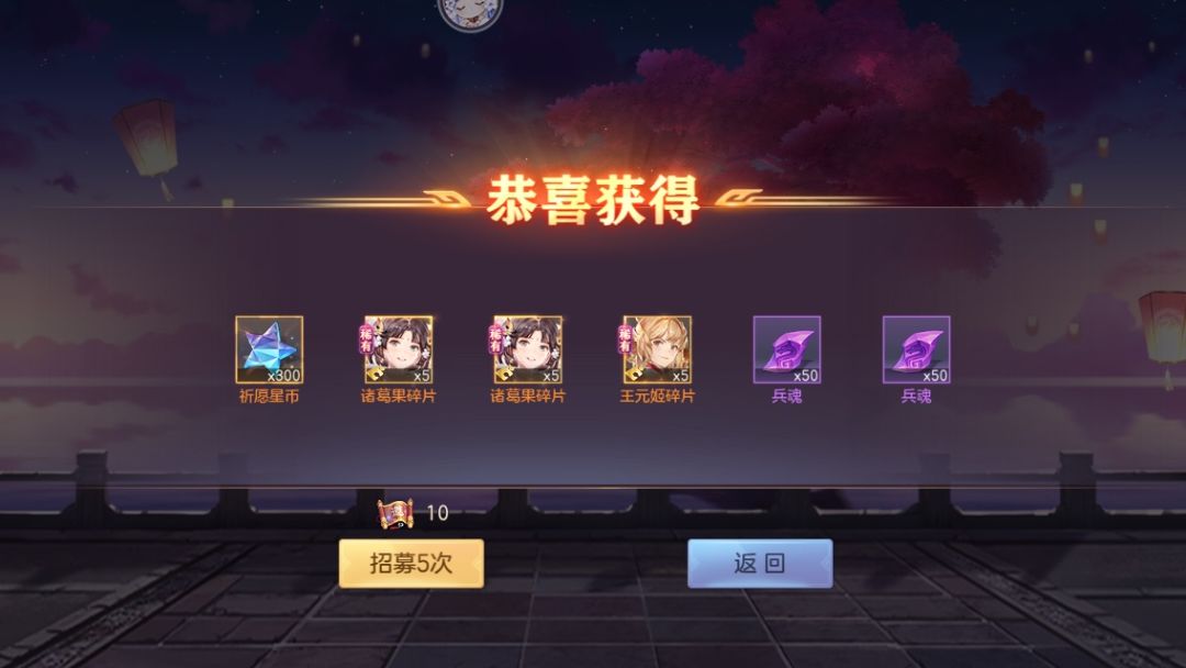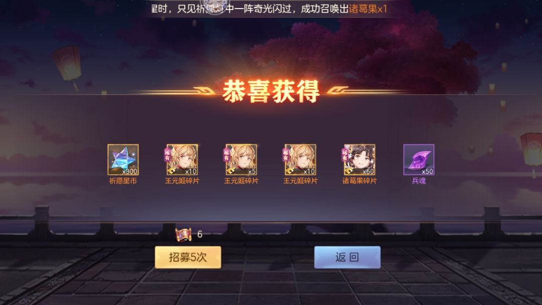 十一次也就是55抽出了三个,几乎是百分之五点概率,还好没有亏到,目前诸葛果四星王元姬三星,星币加上之前的能换48乘5:碎片