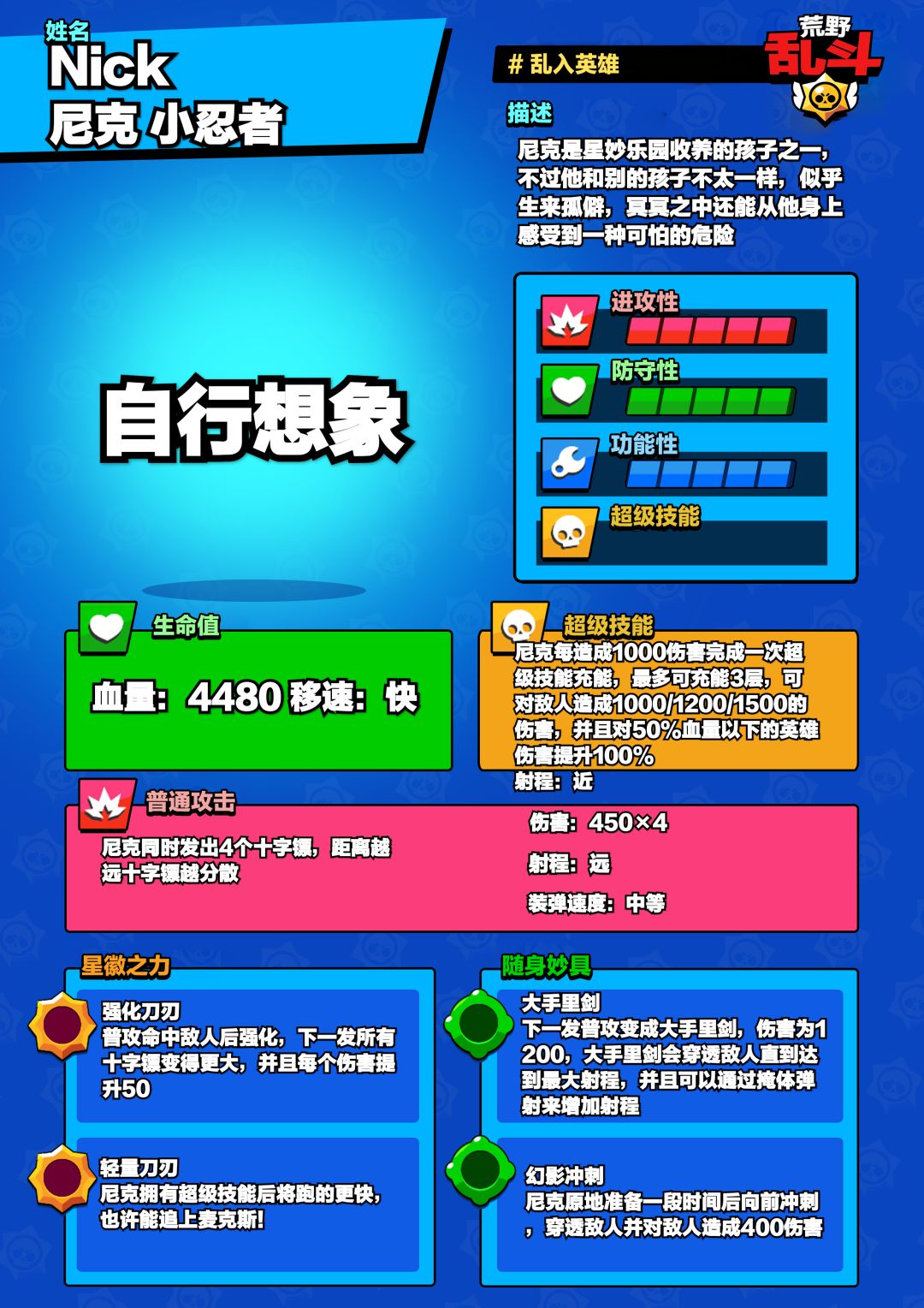 尼克每造成1000伤害为超级技能充能一次,最多充能3层。第一层为正常黄色,造成1000伤害;第二层为橙黄色,造成1200伤害;第三层为红色,造成1500伤害(脚底黄圈/篮圈颜色不变)。一刀斩对血量低于50%的英雄造成伤害提升100%