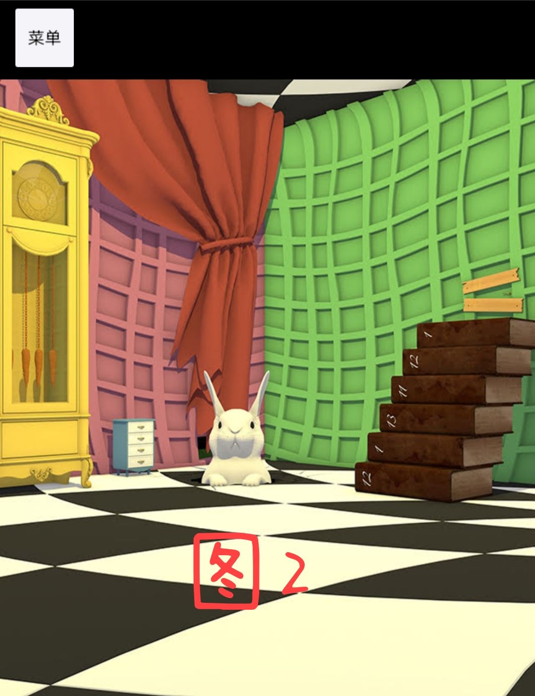 图二,茶话会的茶壶里有一只兔子,粉色房间里面,大黄色箱子里面还有一只。