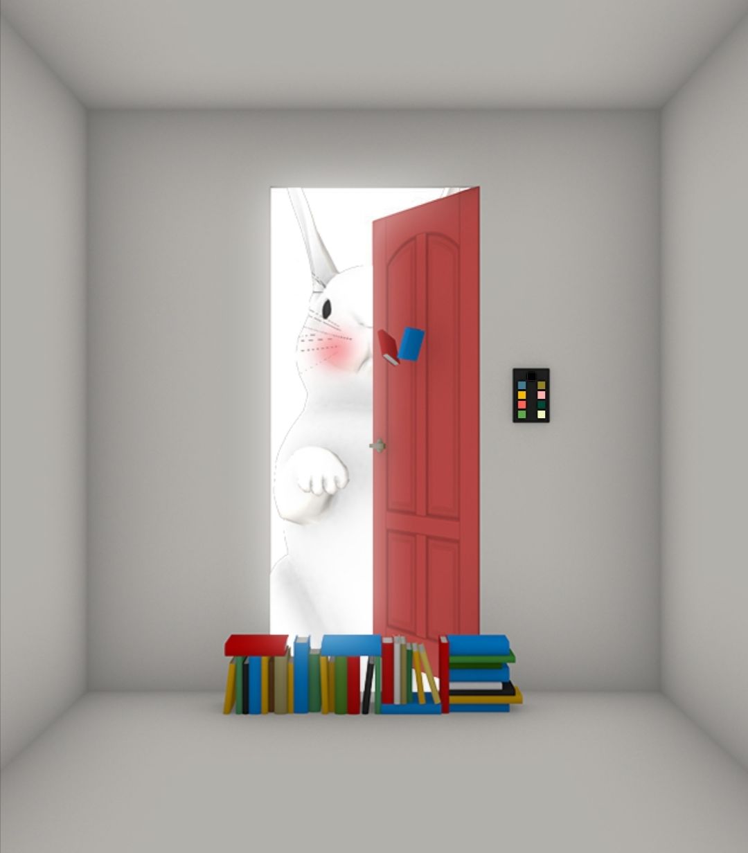 图四,大书的右侧靠近绿色柜子那边有一只兔子,最后一只兔子就是打开粉红色的的门