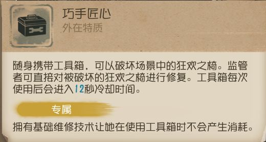 ② 在利用工具箱破坏狂欢之椅时,要灵活的利用护盾辅助拆椅子。把控好距离不要离监管者太近,避免护盾还没出来就被攻击,满状态对园丁来说非常重要。