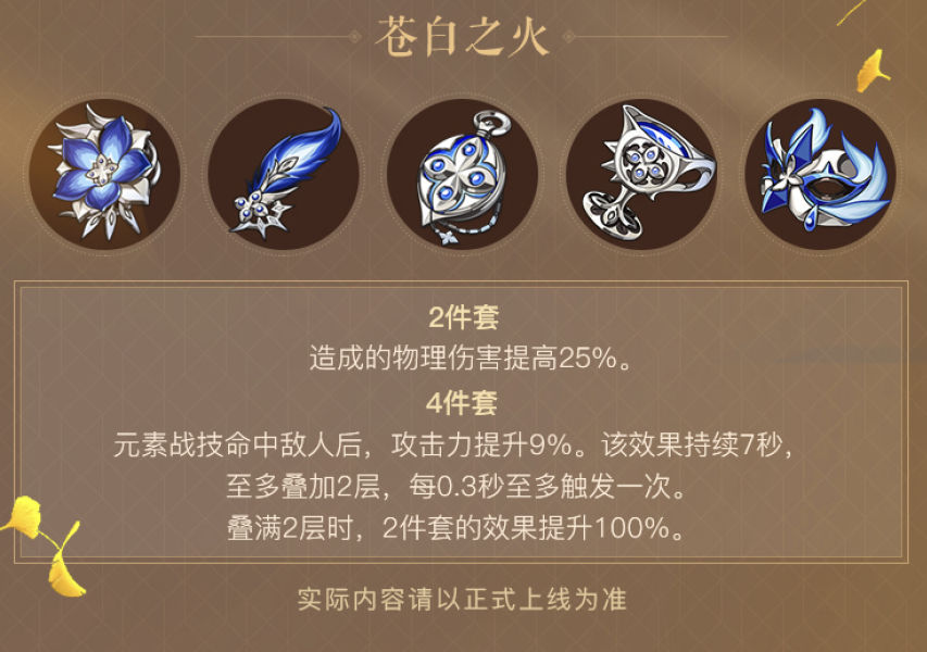 综上分析,由于过于强大的属性加成,策划给了新物流套一定启动时间的限制,但总体来看,新物理套泛用性远超其他圣遗物,启动快的直接四件套,启动慢的2+2组合全程50%物伤也很香,如果你想玩物理c缺不知道刷什么,双苍白双染血绝对是最通用的选择。总而言之,新物理套很强,但是还没有过分到老圣遗物直接下岗的地步。