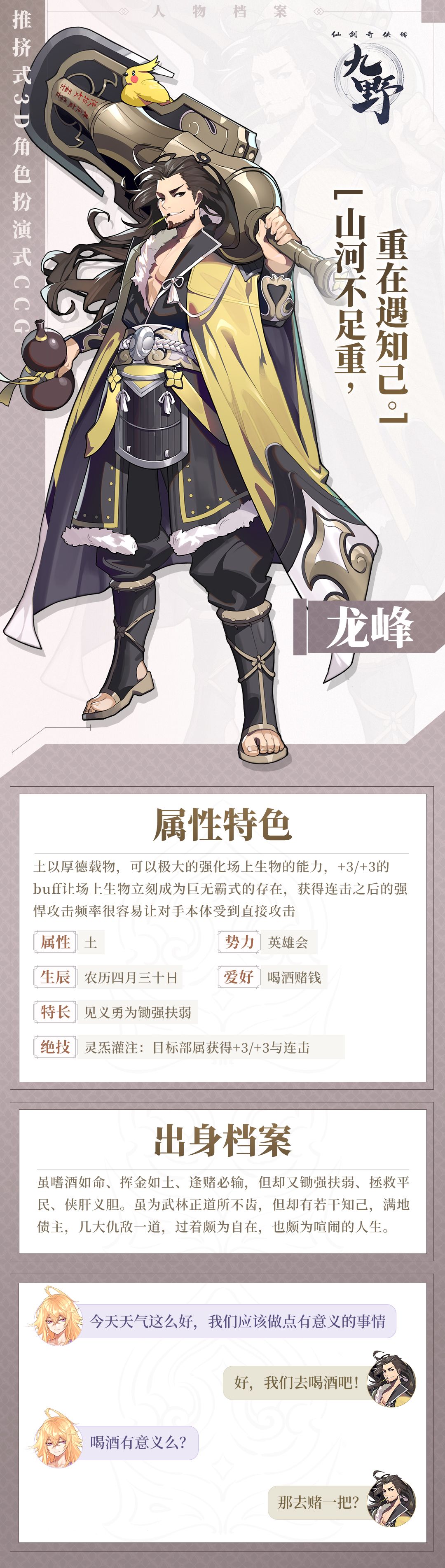 草莽聚而诞江湖,江湖多得是红尘纷扰、恩怨情仇,修道者避之不及,以免耽误进境。然而亦有生性无拘无束之人,入世逍遥,行事全凭本心,亦能证得大道,武林浪子——龙峰,便是此类异数。