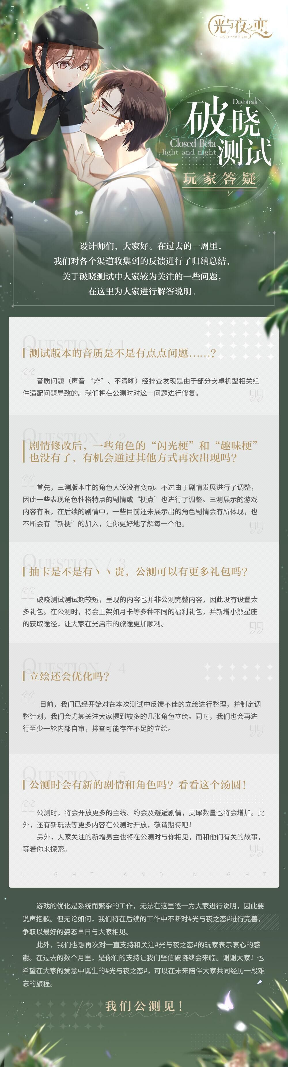 破晓测试结束后,我们整理了大家通过各个渠道进行的反馈,这些反馈将作为我们后续产品调优的重要依凭。感谢每一位支持光与夜之恋的玩家!