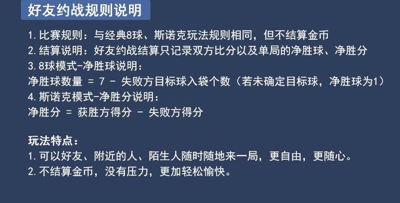 好友对战与经典8球、斯诺克玩法规则相同,但不结算金币;结算只记录双方比分以及单局的净胜球、净胜分。8球模式的净胜球数量=7-失败方目标球入袋个数(若未确定目标球,净胜球为1)。而斯诺克模式的净胜分=获胜方得分-失败方得分。