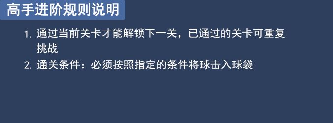 2、 通关条件,必须按照指定的条件将球击入球袋。