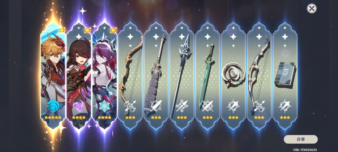 我今天去查了一下他们所说的玄学抽罗莎利亚的办法,说他喜欢喝酒,然后到蒙德城的酒馆里抽罗莎利亚我就真去了酒馆里。我本来存下4颗纠缠之缘就来了第一个up10连抽啥都没有,我想到我还有8个相遇之缘加砖石320也来了一次10连抽,好像也只有一把4星的武器,然后又回到up池里单抽了两次,然后就再一次10连就出了上面这图里的东西。笑死我了。我心想今天运气把所剩的所有钻石都花光了给公子买武器结果一件五星武器都没有。我现在就是差武器了。