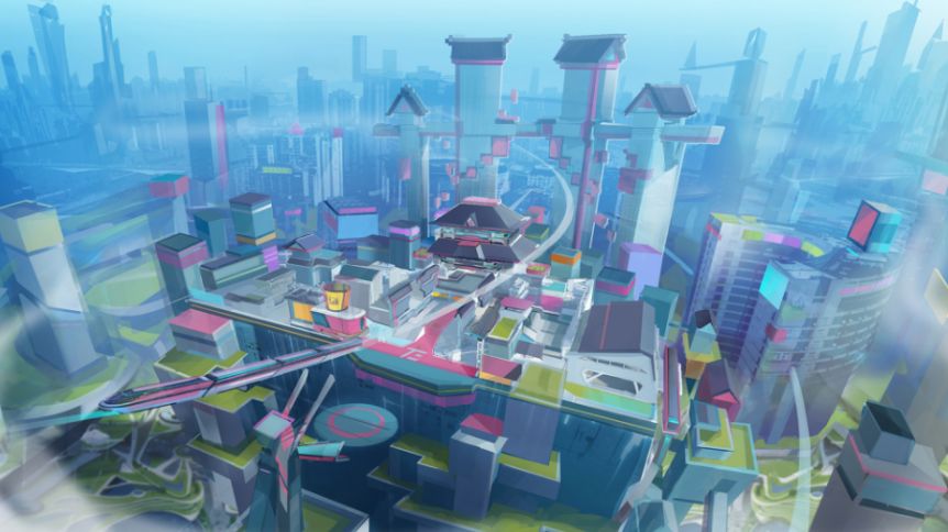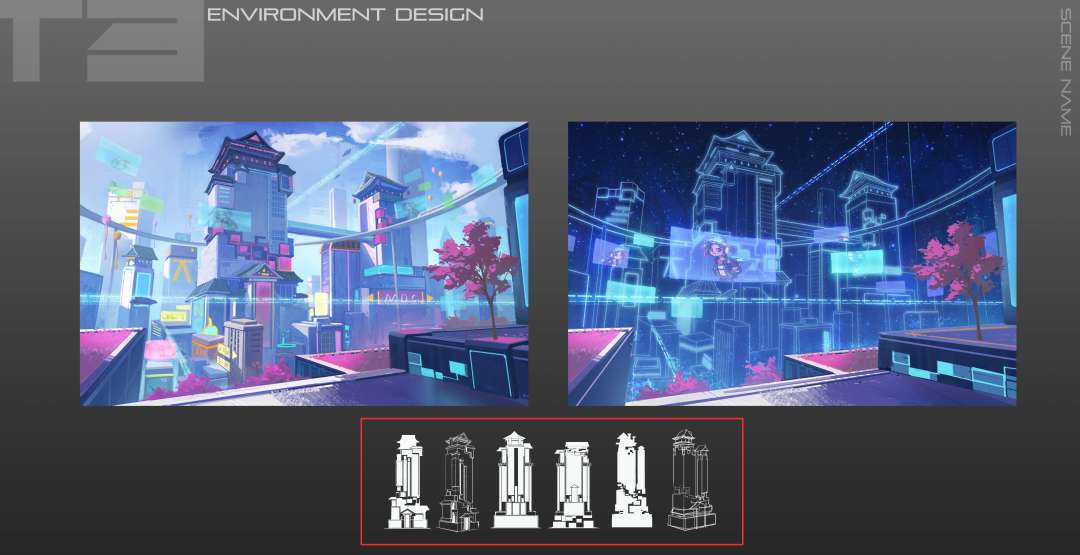 作为第一张融入了中国风元素的场景,我们在制作过程中有过很多新的尝试,比如说科技元素与中国传统元素的融合,趣味性与炫酷风之间的取舍等等。在初期的尝试过程中,也诞生了许多奇思妙想,比如说下面这张已经被废弃的概念稿,我们甚至想过赋予这张地图另一种形式的表现,让它变成一个“虚拟世界”,所有建筑的轮廓都用荧光线来表达。