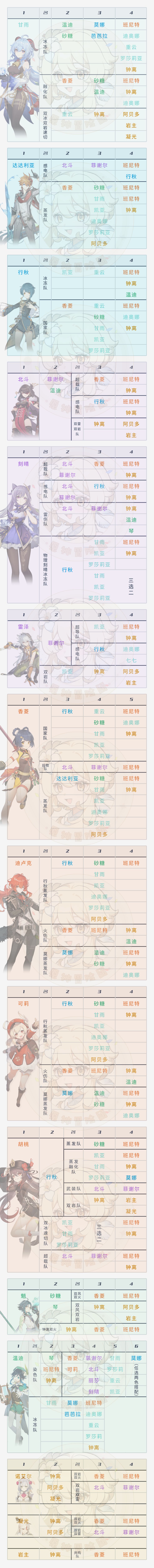 首先选出2-4位主站场角色,可以看到甘雨、胡桃、香菱、北斗都有。然后确定深渊上下两层队伍,本期12层没有需要破盾的地方,唯一要注意的就是12-2的讨债人的火抗、雷莹的雷抗、冰莹的冰抗以及冰盾、12-3的小宝、遗迹重击的物理抗性。上层可以【胡桃、行秋、砂糖、班尼特】或者【香菱、北斗、菲谢尔、班尼特】或者【香菱、行秋、重云、班尼特】或者【香菱、达达利亚、砂糖、班尼特】,下层可以用温迪、莫娜、甘雨、迪奥娜冰冻队。