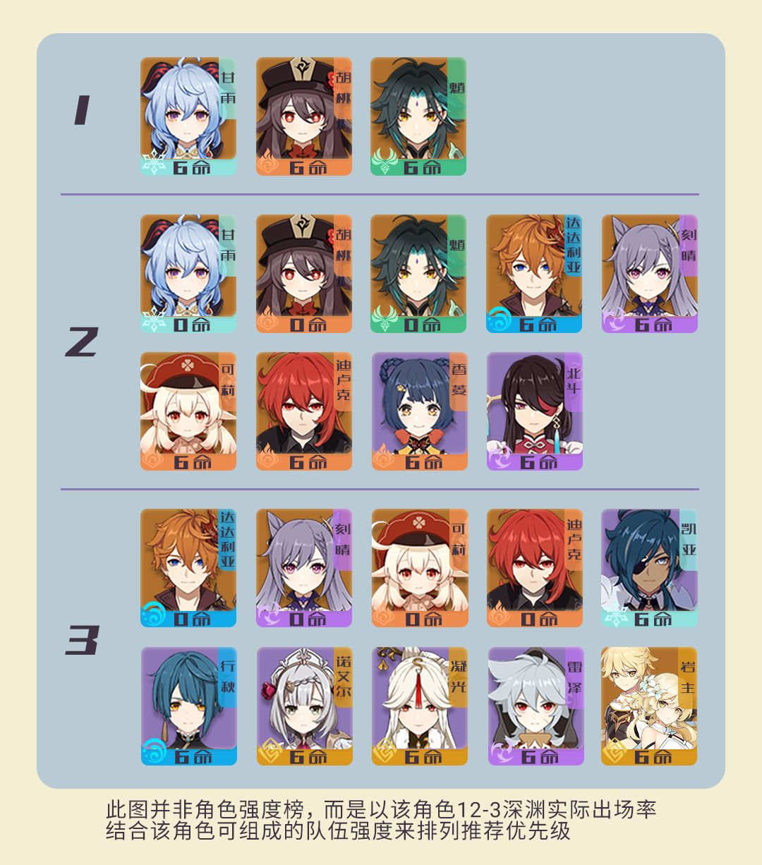 主要站场角色指的是站场时间占比相对较高的角色,此图并非角色强度榜,而是以该角色12-3深渊实际出场率结合该角色可组成的队伍强度来排列推荐优先级。