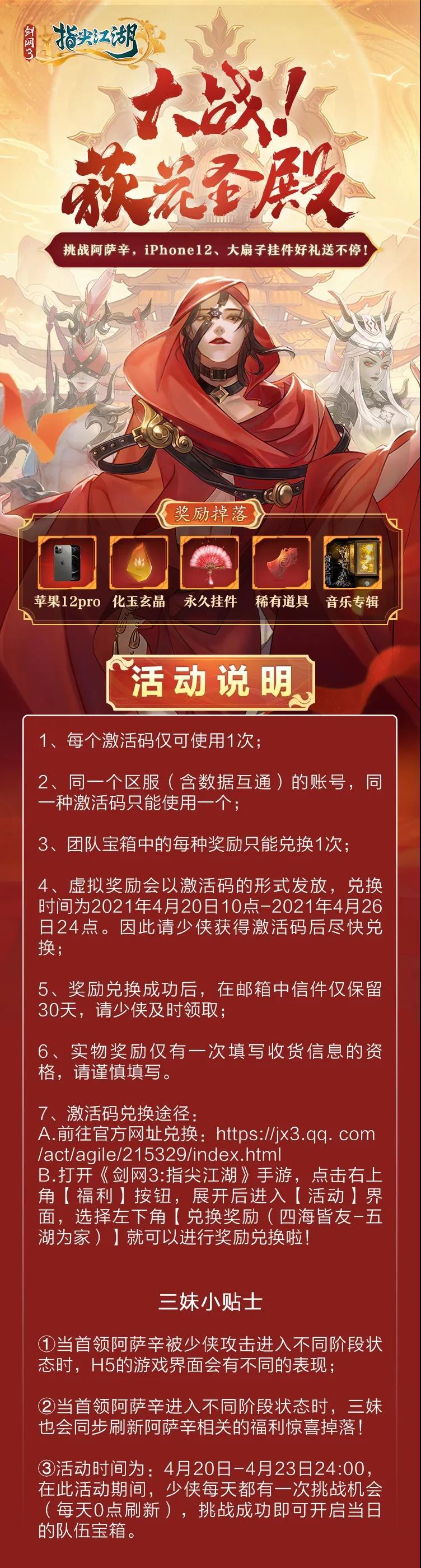3妹已与卫大侠在【大战!荻花圣殿】门口组队,就等少侠啦!快和卫大侠一起挑战阿萨辛,赢取iphone12和大扇子,走上人生巅峰吧~