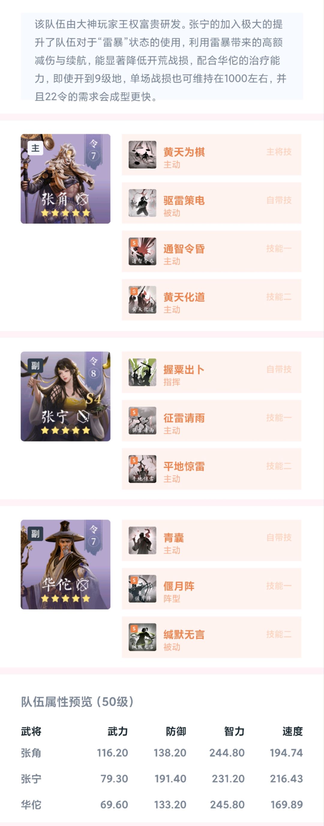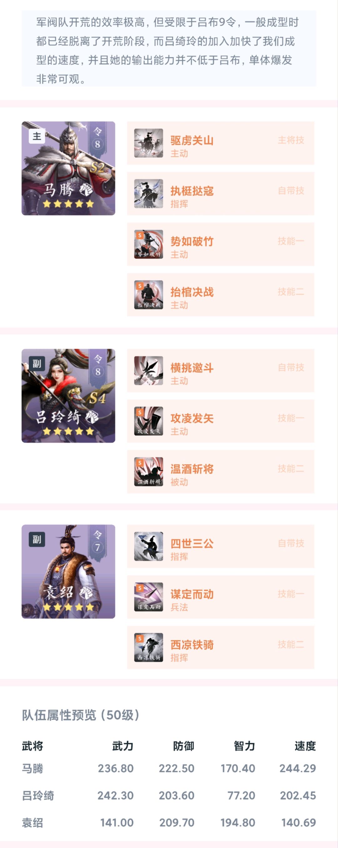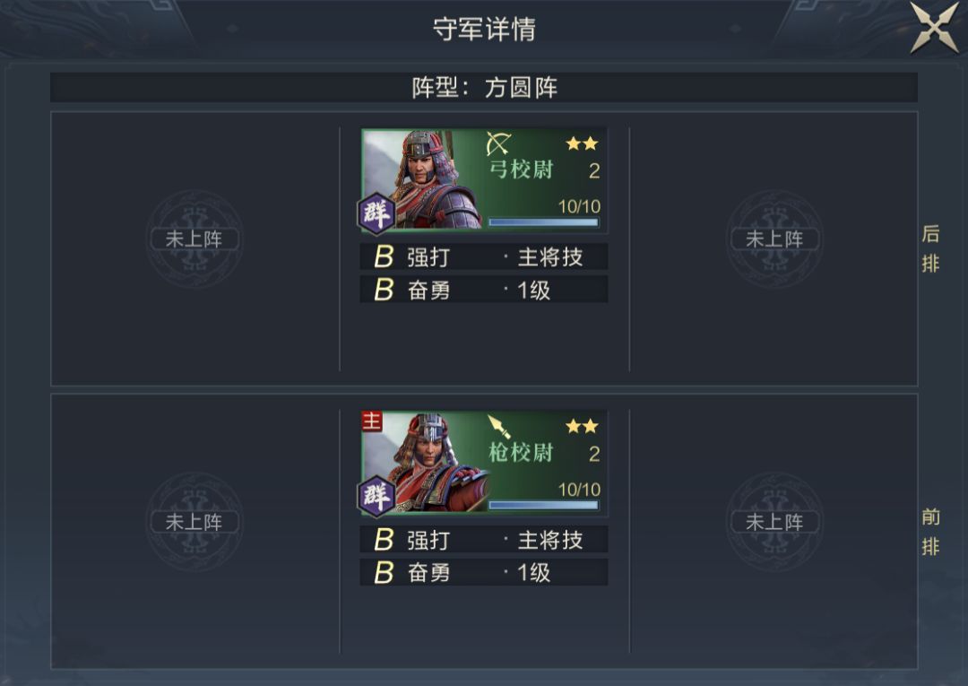 该野地两名副将拥有6个输出技能,附带减防、驱散、缴械、减智效果,而主将处于后排,拥有属性加成技能,并可降低我方智力伤害,提升其友军武力伤害,整体输出较高,低战损突破难度较大,刚接触5级地时不建议尝试,建议使用124或235站位。