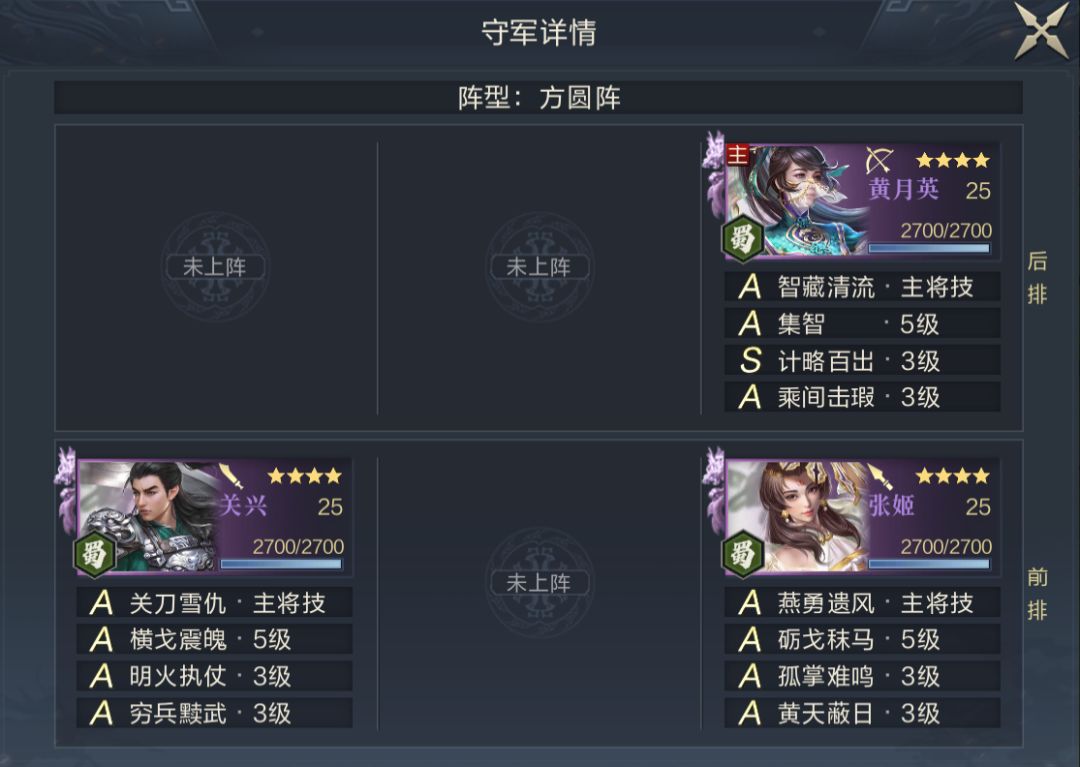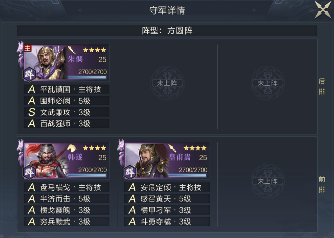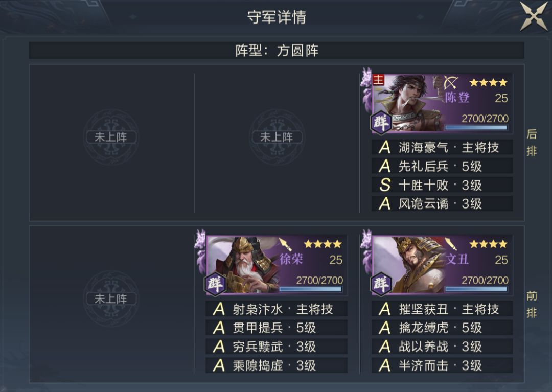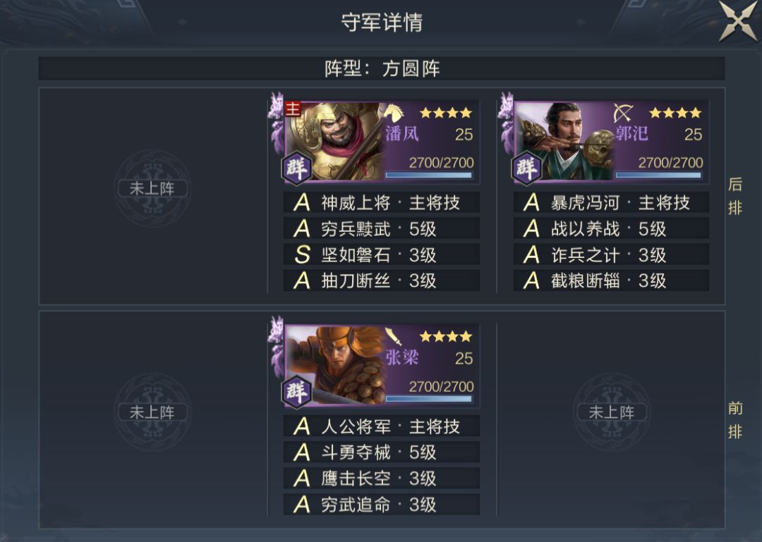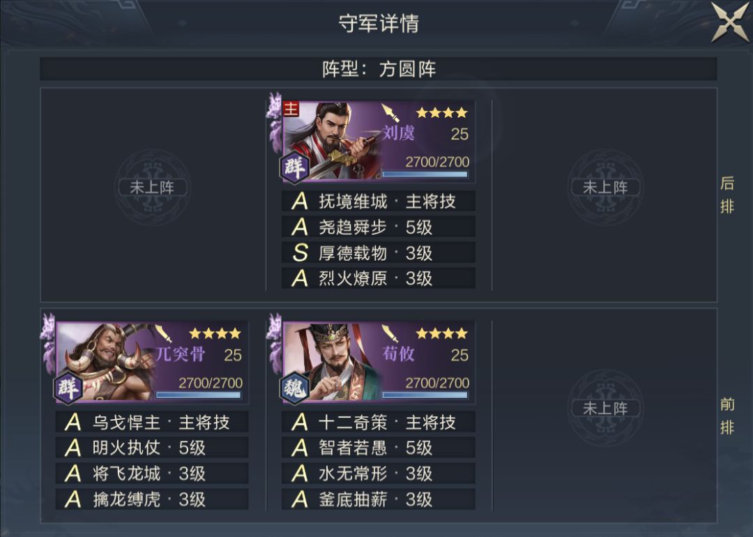 S4中5级地的武将品质与技能品质和S3一样,均为紫将+全A技能(主将1个S),略有不同的是守军阵容和站位变化较大,特别是守军技能配置中输出技能较多,输出技能主要分配给副将,而主将输出技能较少,荀彧的力竭效果会受一定的影响。