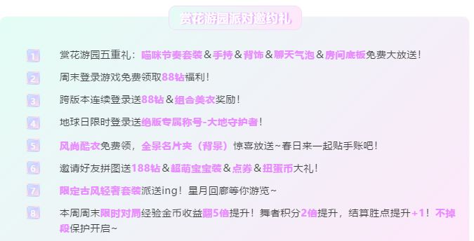 4月24日-4月25日(本周末)晚8点-晚12点期间,对战中心&休闲大厅开启经验金币收益翻5倍提升!舞者积分2倍提升,结算胜点提升+1!还将开启不掉段保护~