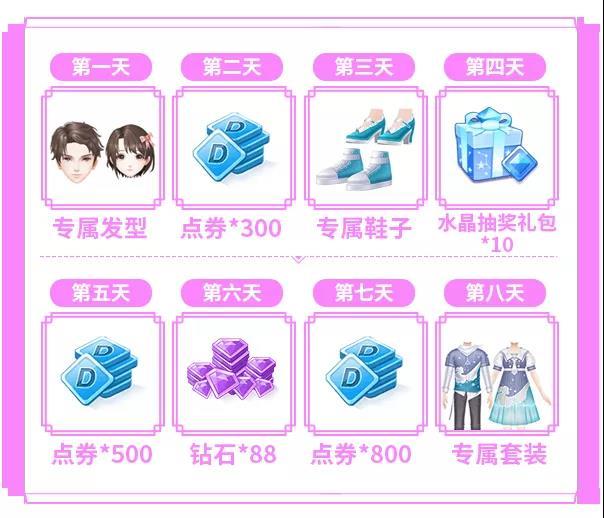 4月25日-5月15日期间,连续登录游戏合计可以领取钻石*88、点券*1600、水晶抽奖礼包*10、奖励专属套装的四重登录福利!